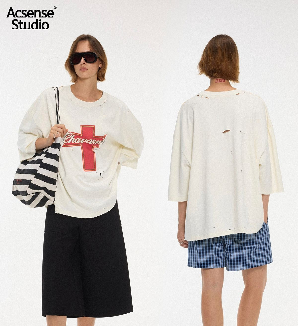 The Heavy Washed Cross Print T Shirt in White — a women's t-shirt from ACSENSE STUDIO. Distinctive design from China's vibrant independent fashion scene. Each collection brings a fresh perspective rooted in the brand's unique design language.
