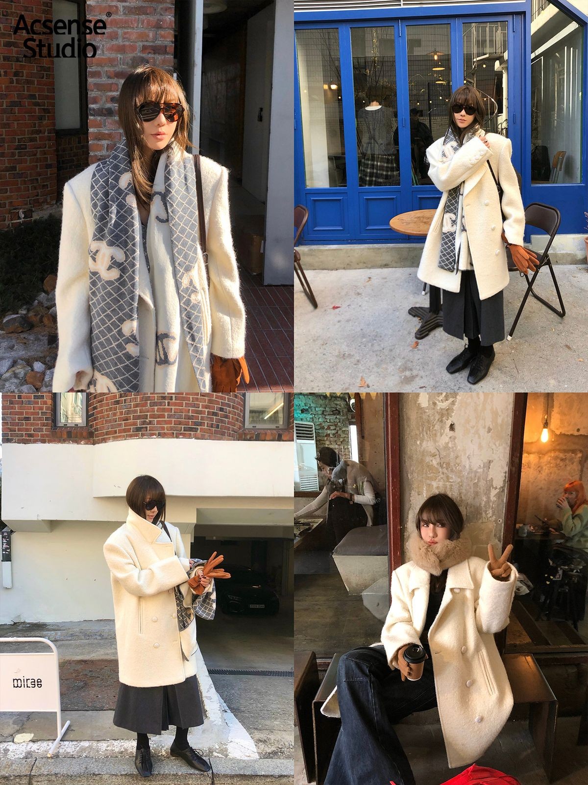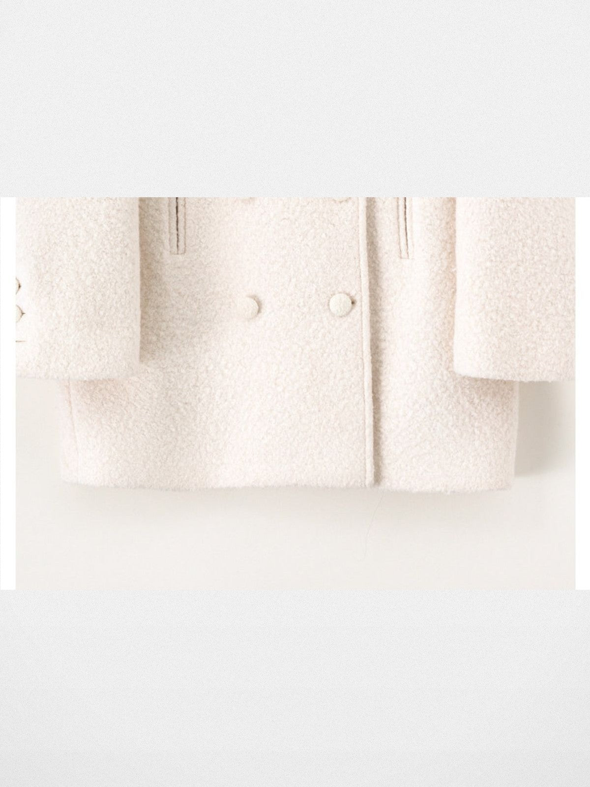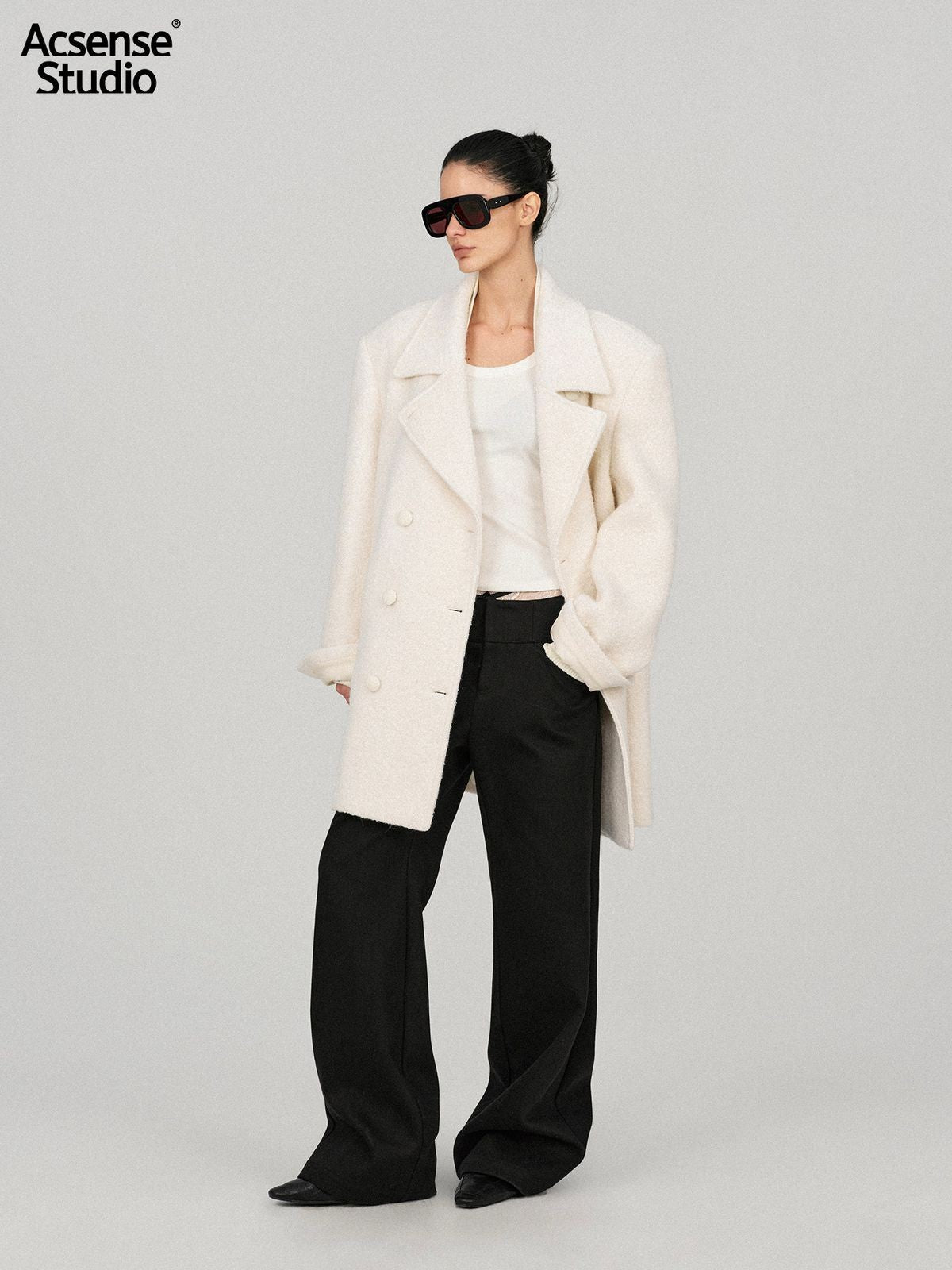 ACSENSE STUDIO's textured coat in a 45% wool, 55% polyester blend. Notched lapels, double-breasted button closure, vertical welt pockets.