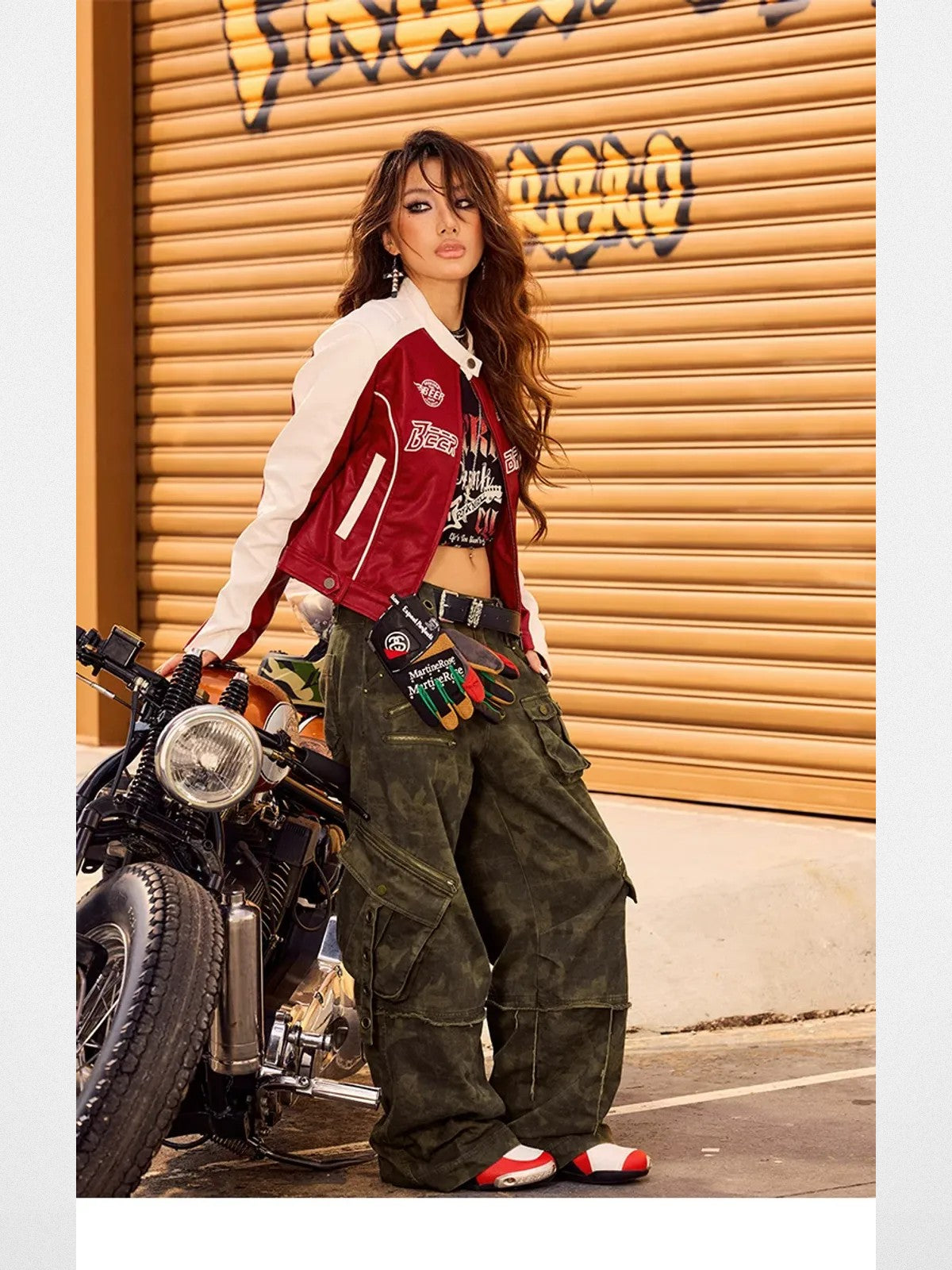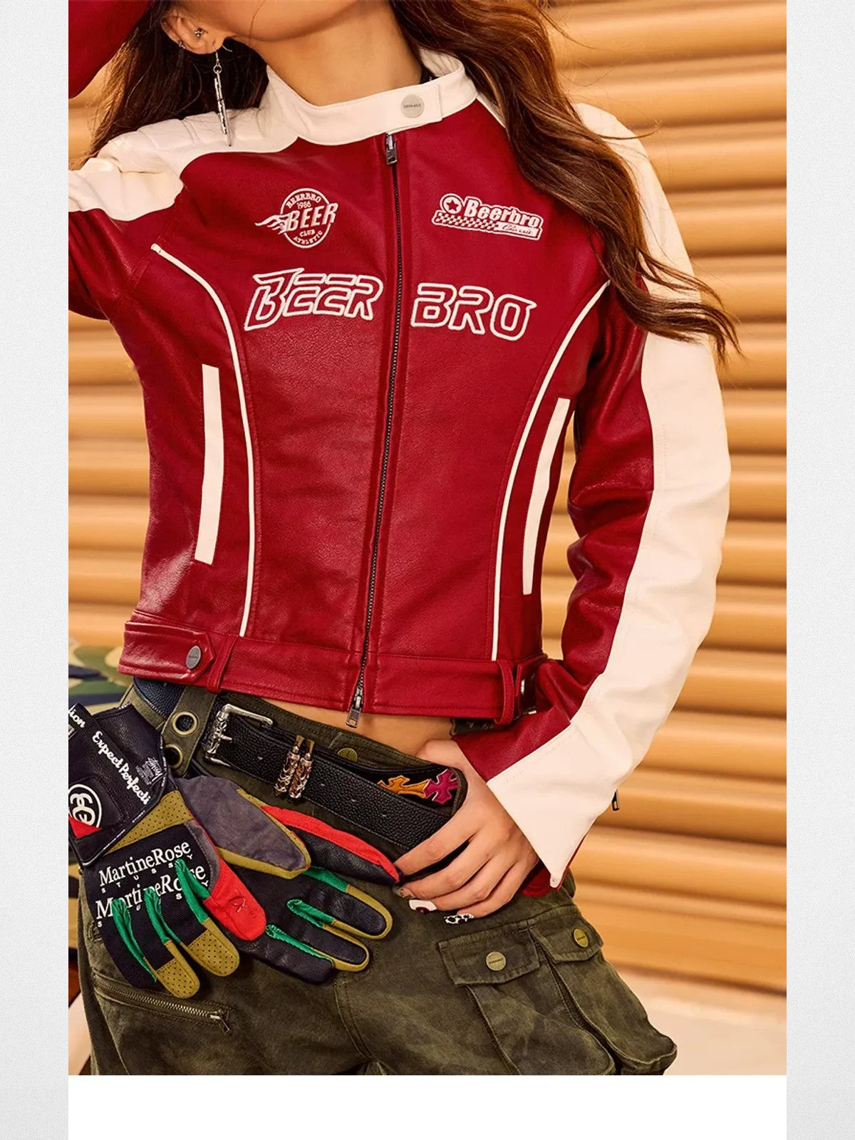 BeerBro's lightweight moto jacket in padded leather and cotton. Features contrast racing panels, logo embroidery, and a zip-front closure with a snap-button stand collar.