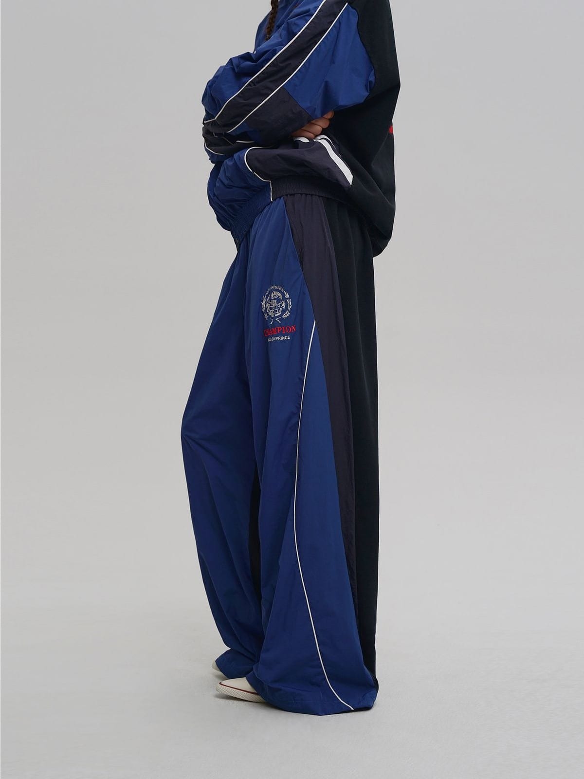 MasonPrince's deconstructed track jacket in a nylon shell with a cotton-blend hood. Features color-blocked panels, chest logo graphics, zip closure, and elasticated trims.