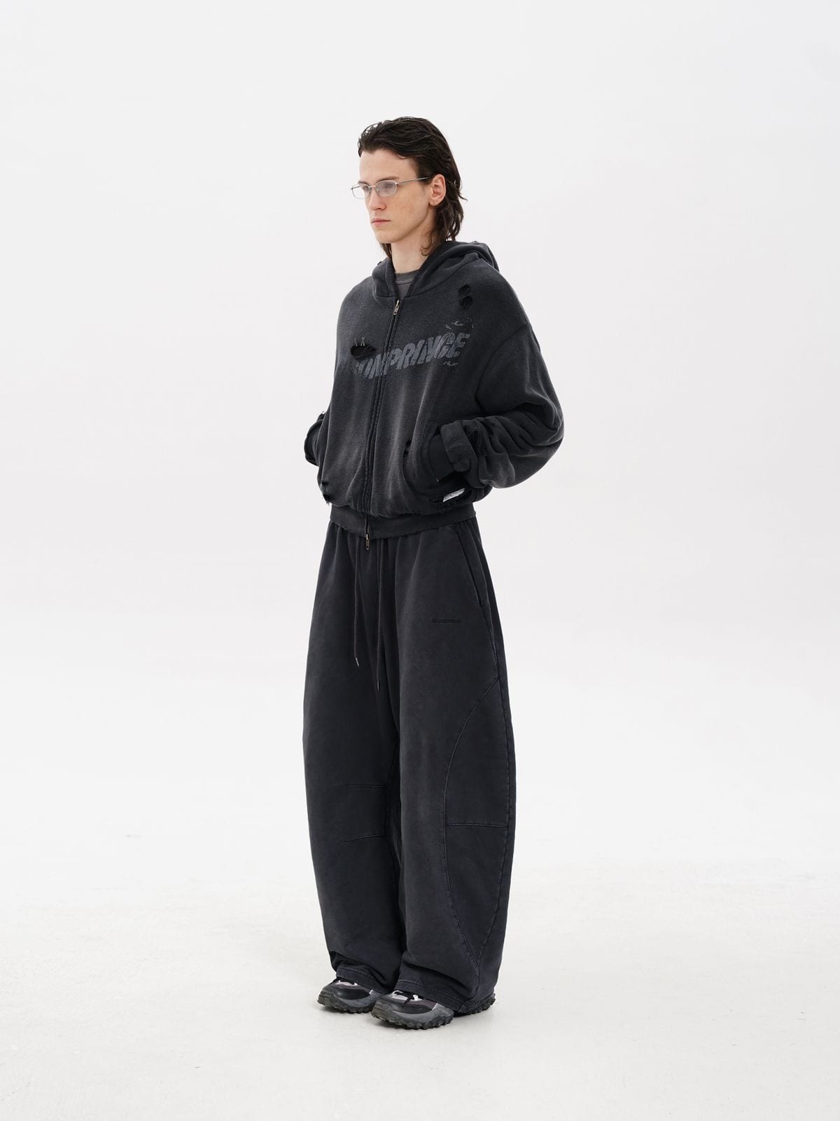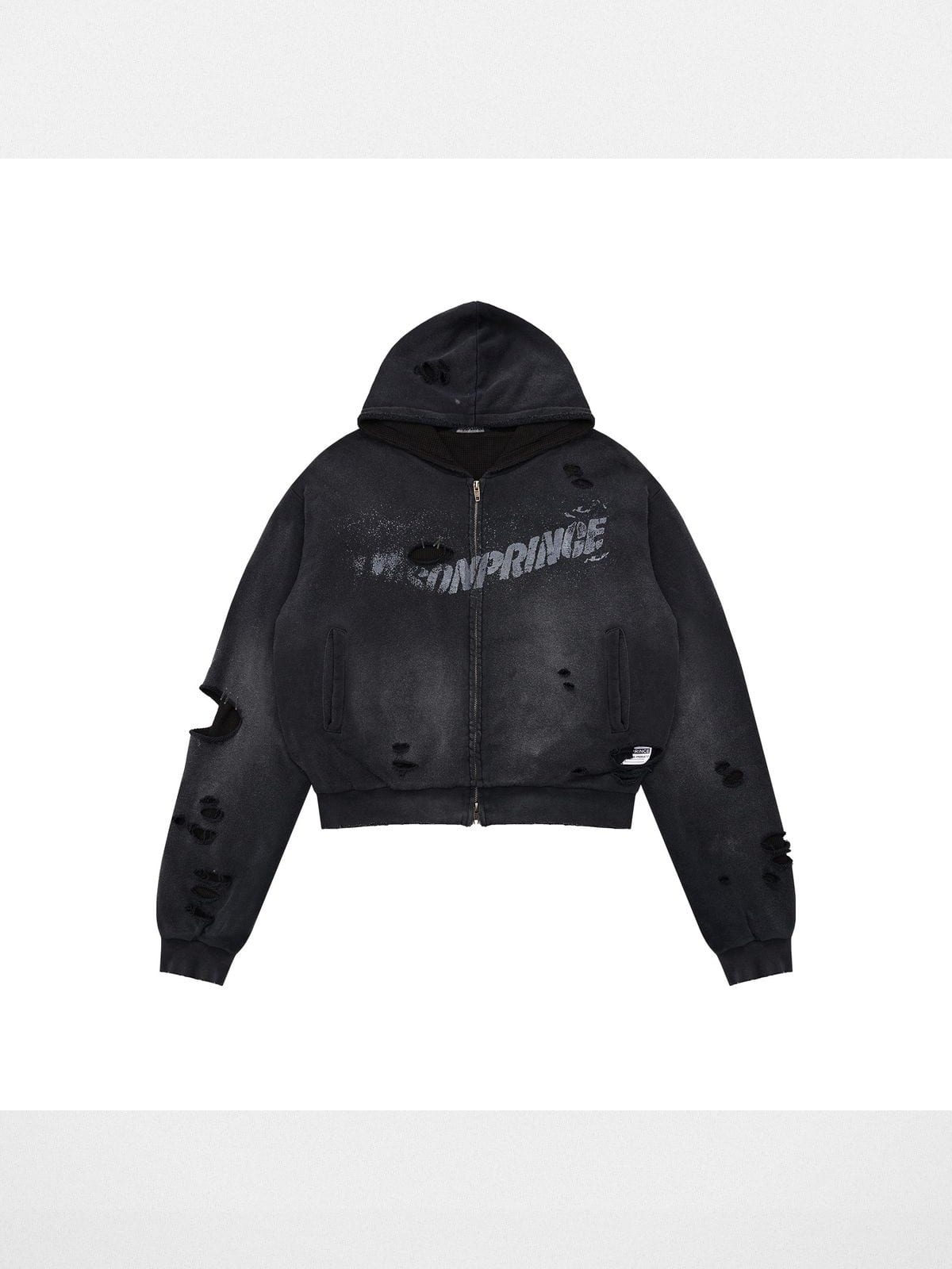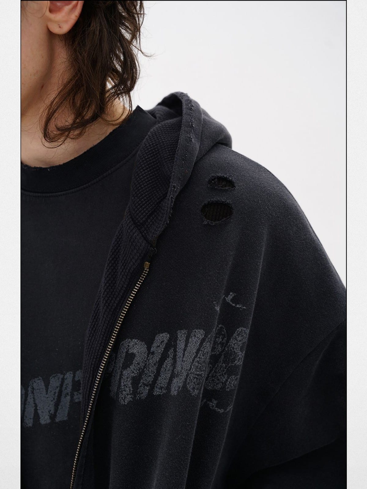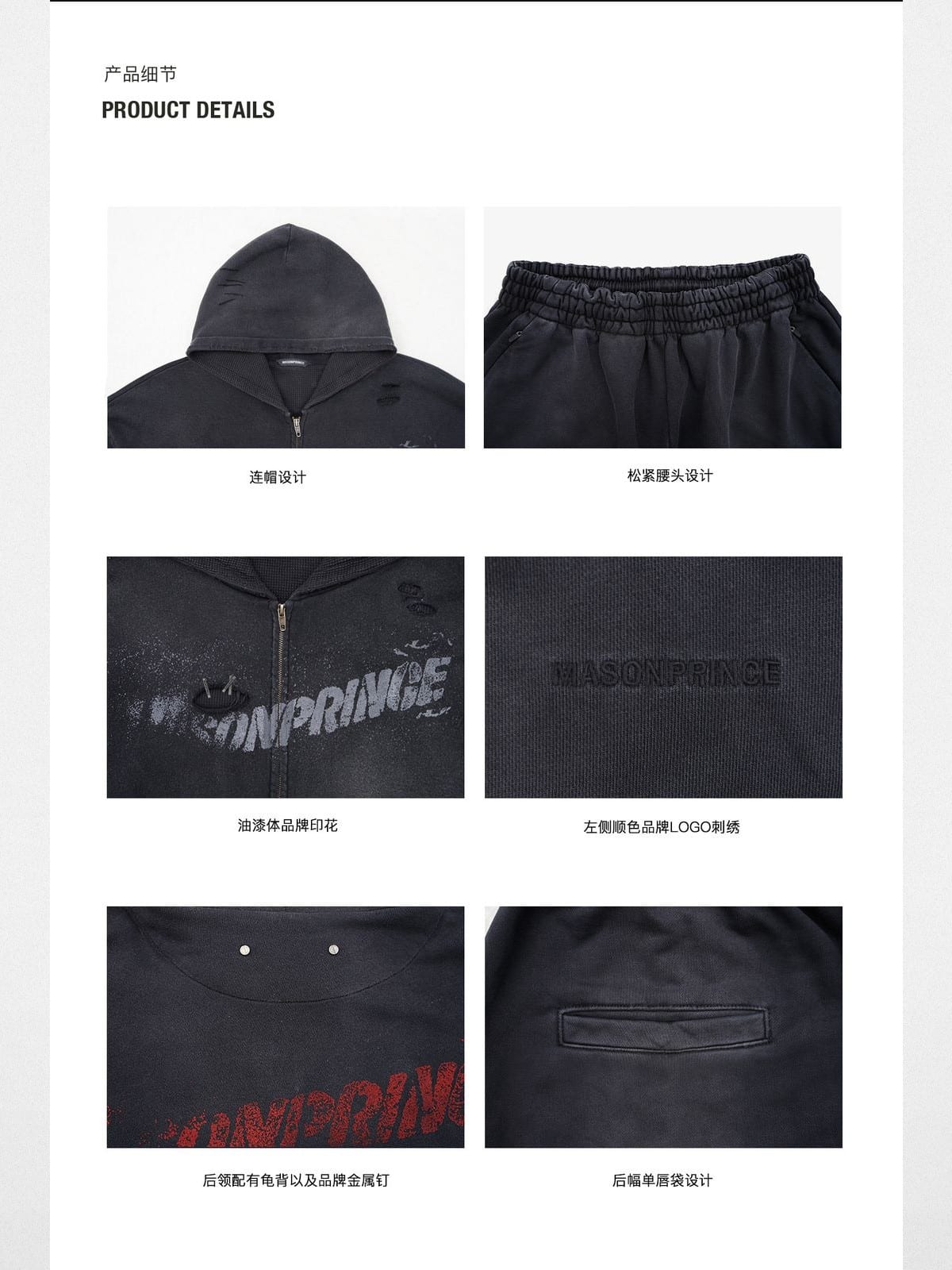 MasonPrince's short-sleeve top in washed 100% cotton. Features a distressed paint-style graphic, metal clip hardware, and a double-layer raw hem with woven branding.