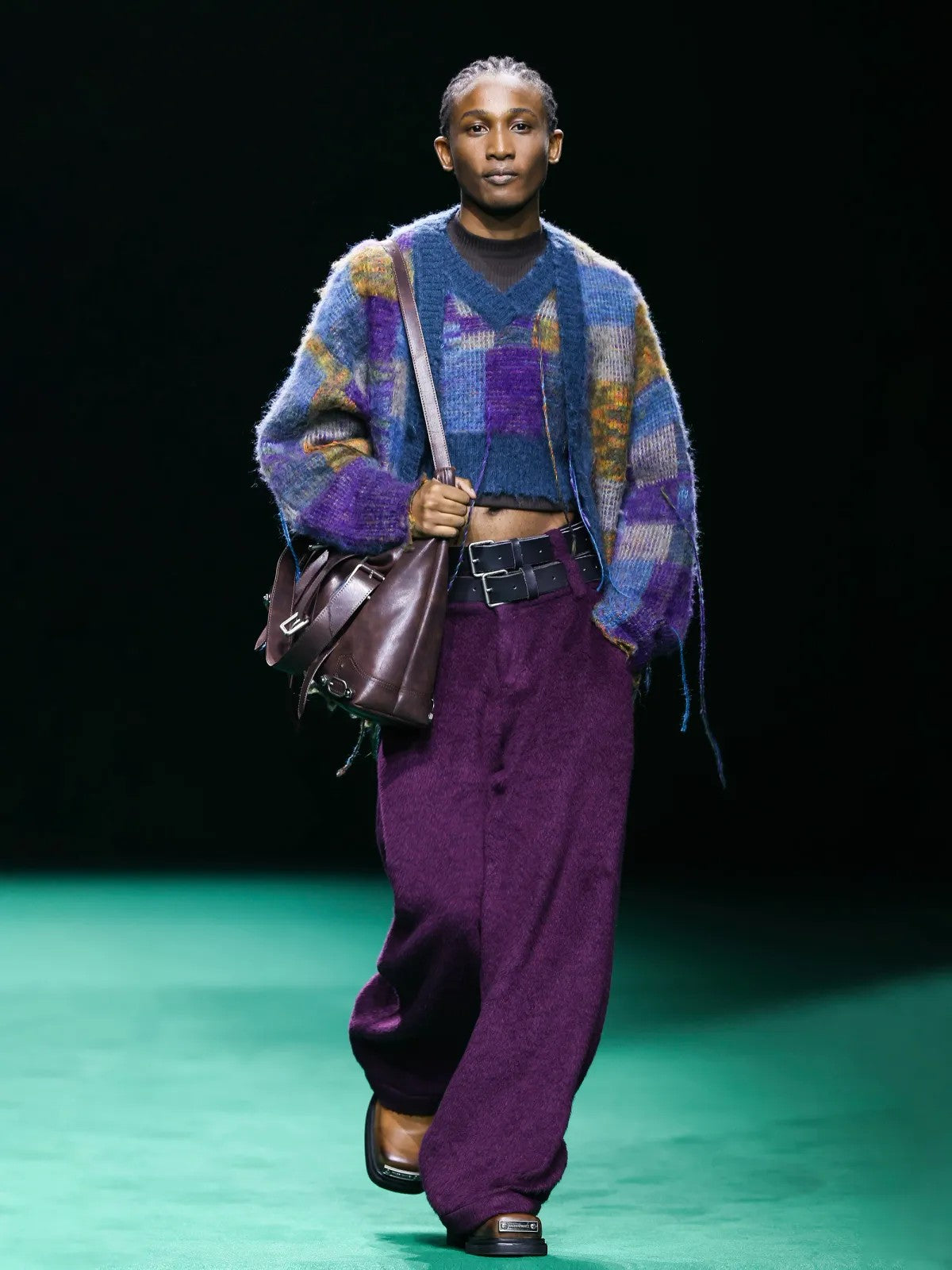 MASONPRINCE's cardigan in a 32% mohair and 28% wool blend. Distorted checkerboard intarsia with hanging fringe accents, ribbed trims, and a button-front closure.