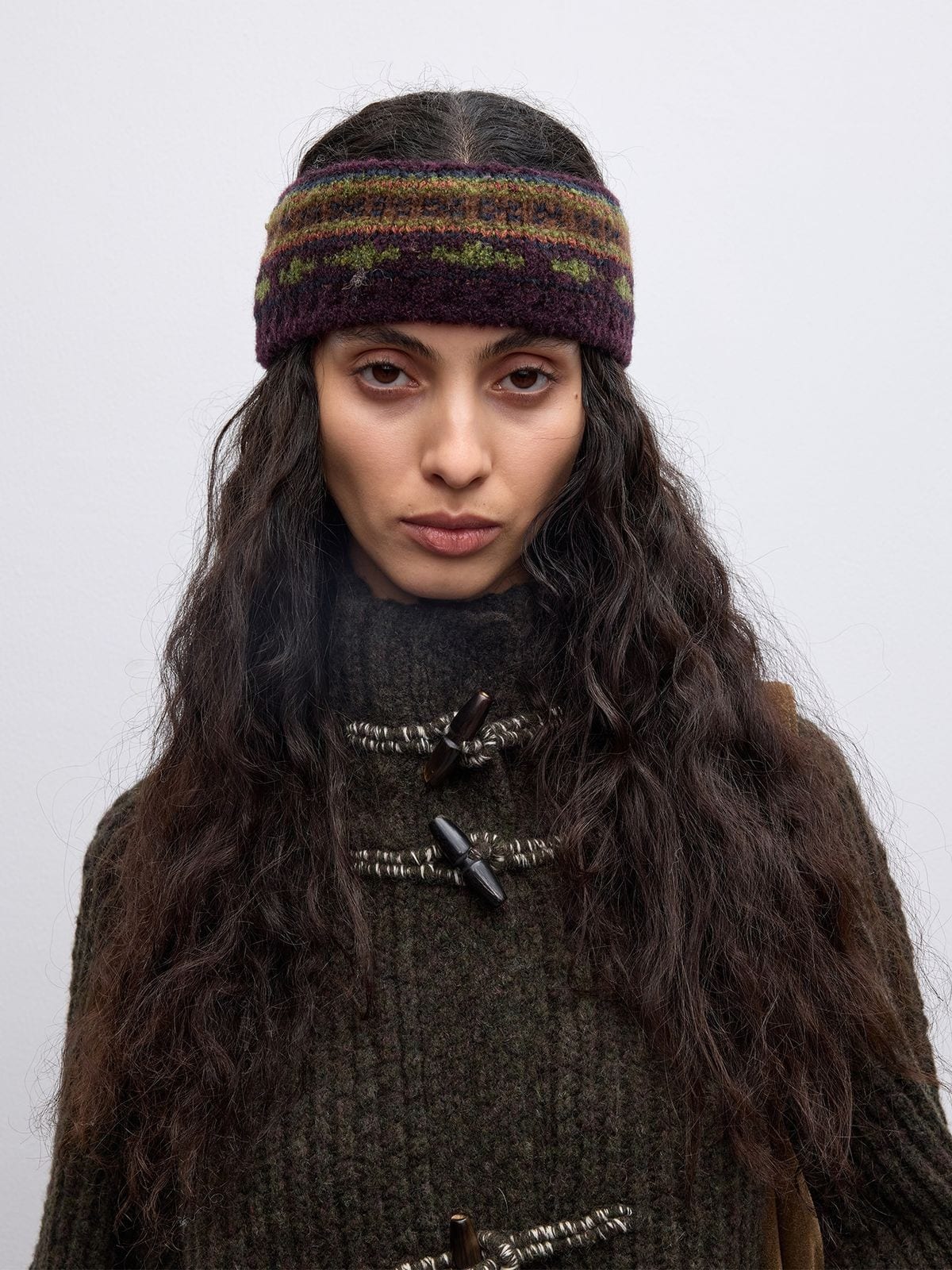Randompiece's longline cardigan in a 71.3% lambswool blend. Features a chunky ribbed knit, high stand collar, and horn toggle button closures.