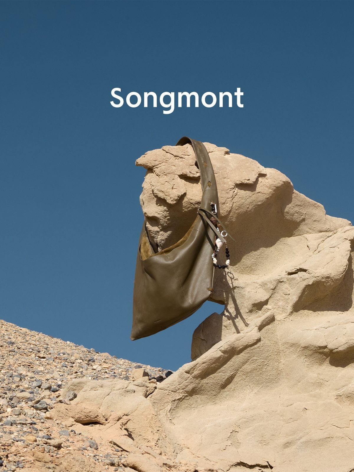 Songmont's unisex crossbody hobo in top-grain leather. Asymmetrical shell silhouette, wide adjustable shoulder strap, suede interior, and zipper closure with tassel accent.