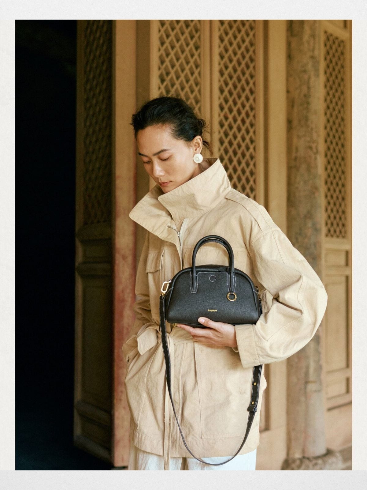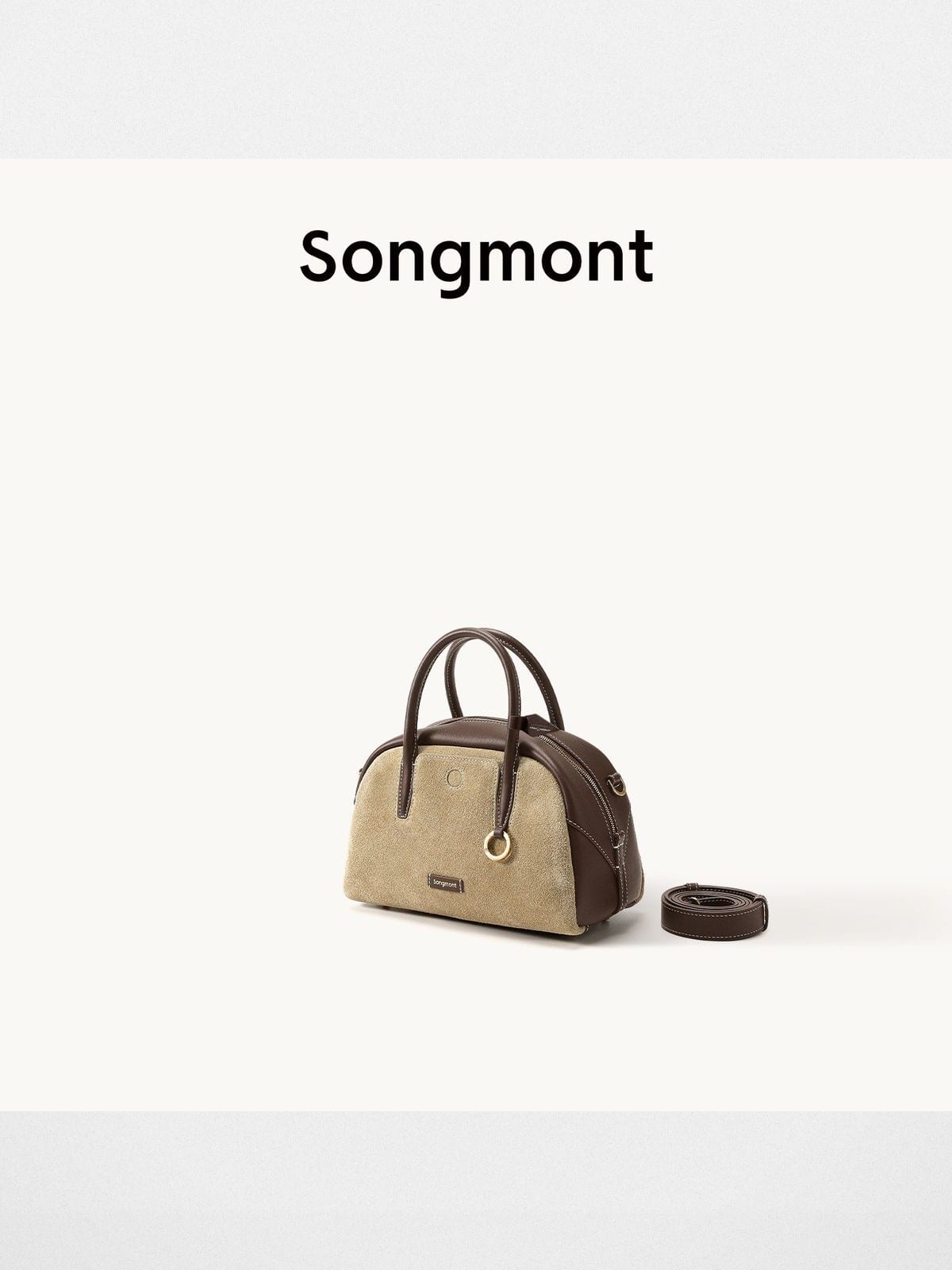 Songmont's mini bowling bag in top-grain cowhide. Double rolled handles, detachable crossbody strap, and 316L stainless steel hardware. Top zip closure.