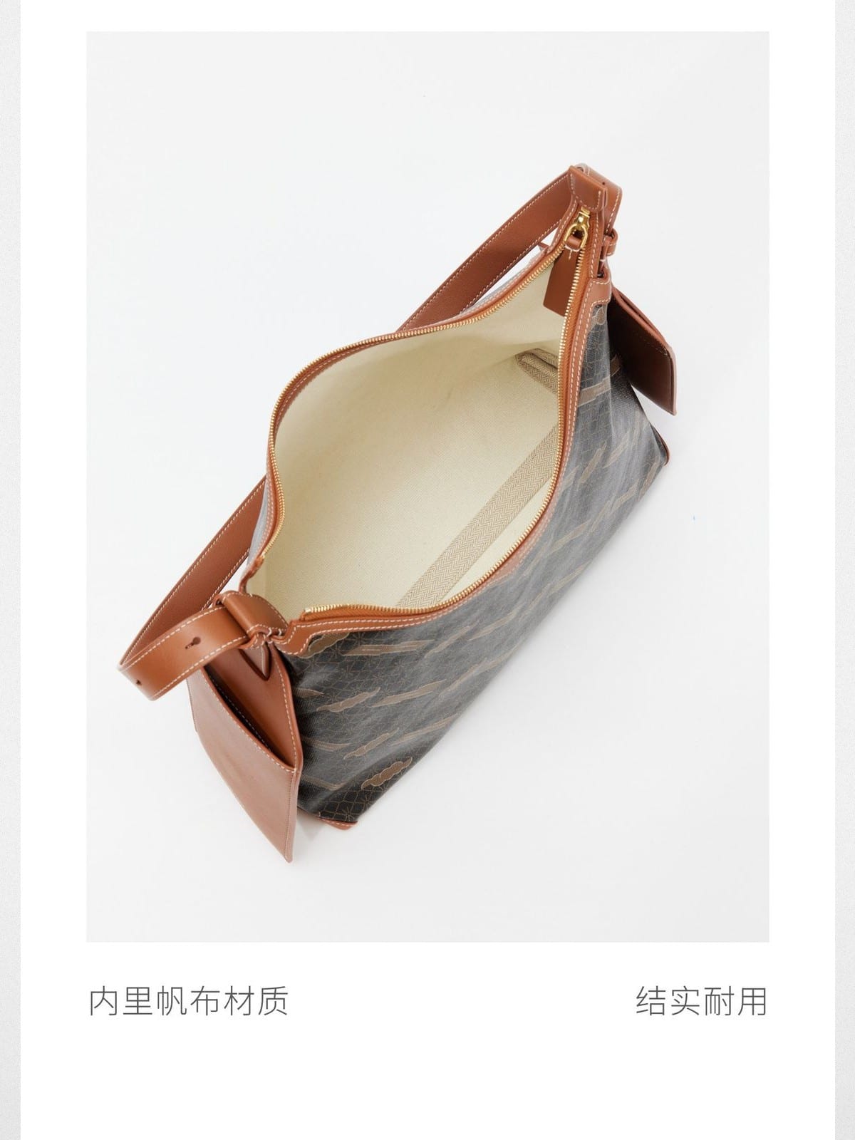 Songmont's hobo bag in TPU blended canvas with calf leather trim. Adjustable strap, zip top closure, 304 stainless steel hardware.
