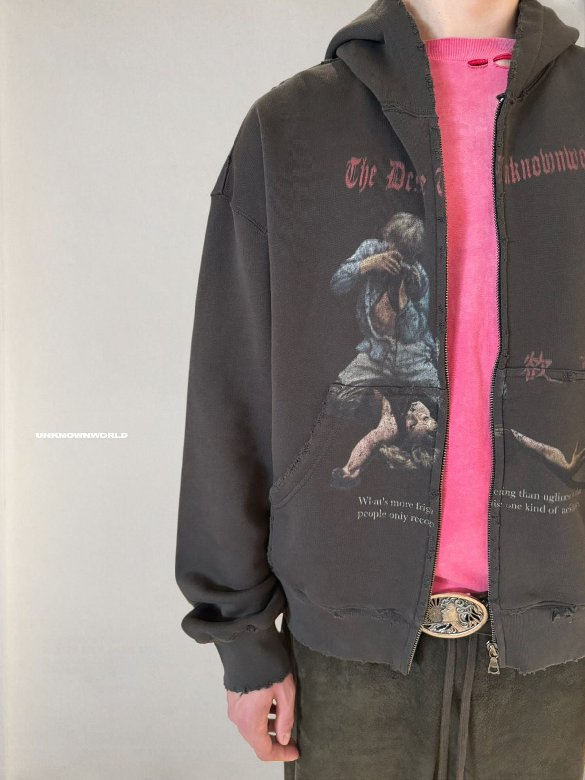 UNKNOWNWORLD's zip-up hoodie in washed 100% cotton. Features a central graphic print, heavy distressing at the hems, and split kangaroo pockets.