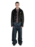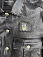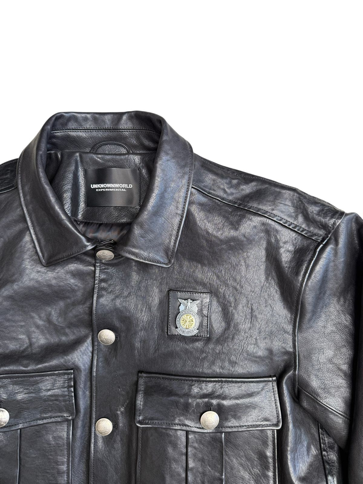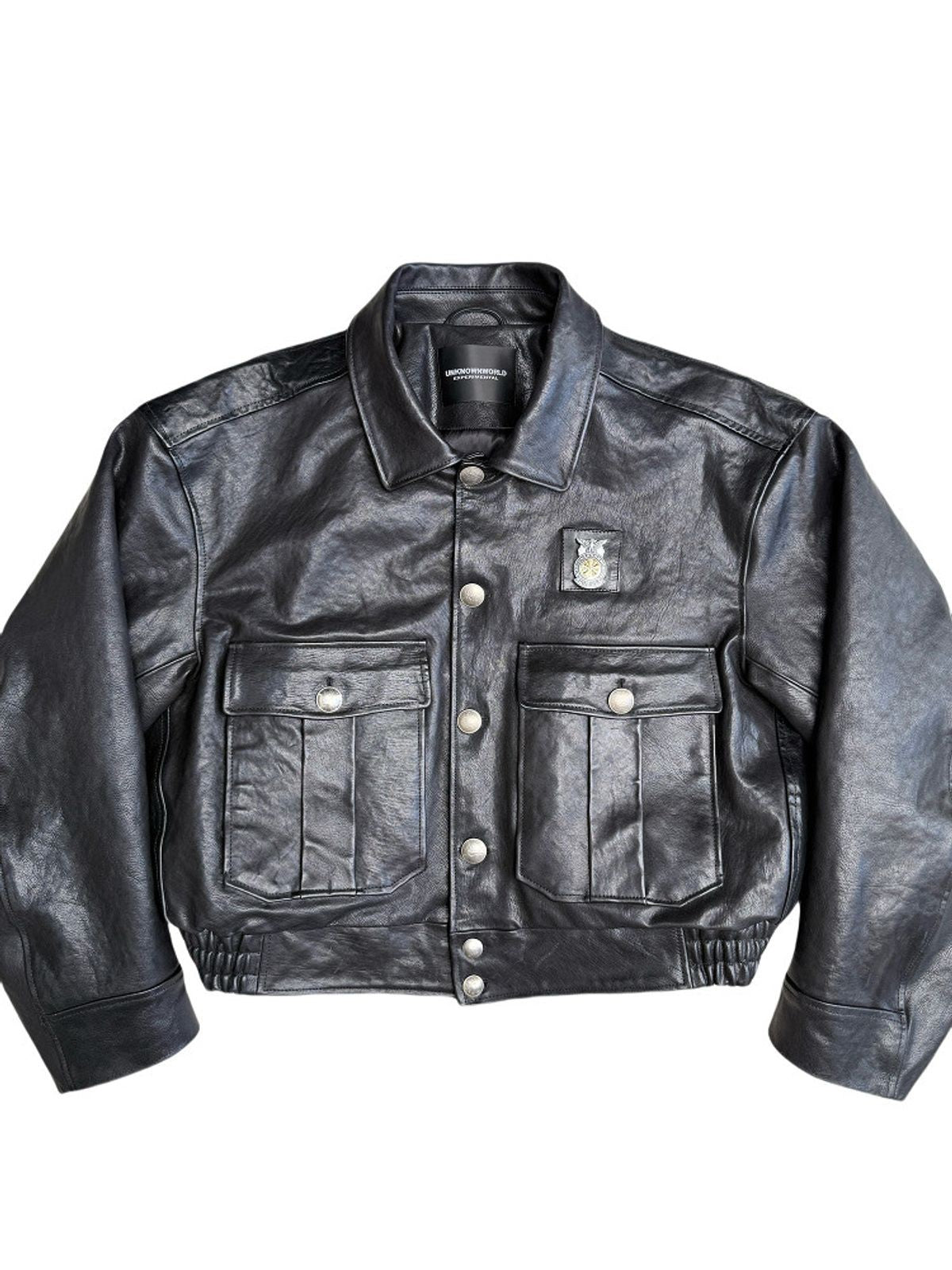 UNKNOWNWORLD's boxy jacket in imported vegetable-tanned horsehide. Spread collar, metal button closure, and dual front flap pockets. Lined in polyester with a chest badge detail and elasticated hem.