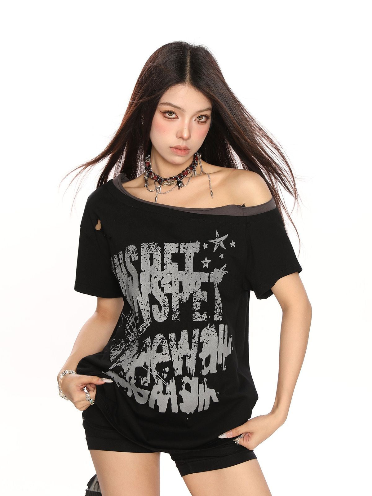 Quality construction meets distinctive design: Punk-inspired tee. Asymmetric off-shoulder neckline, distressed cutout details, and a bold graffiti graphic print. The weight and hand feel set it apart from standard basics — this is a tee built to earn its place in rotation.