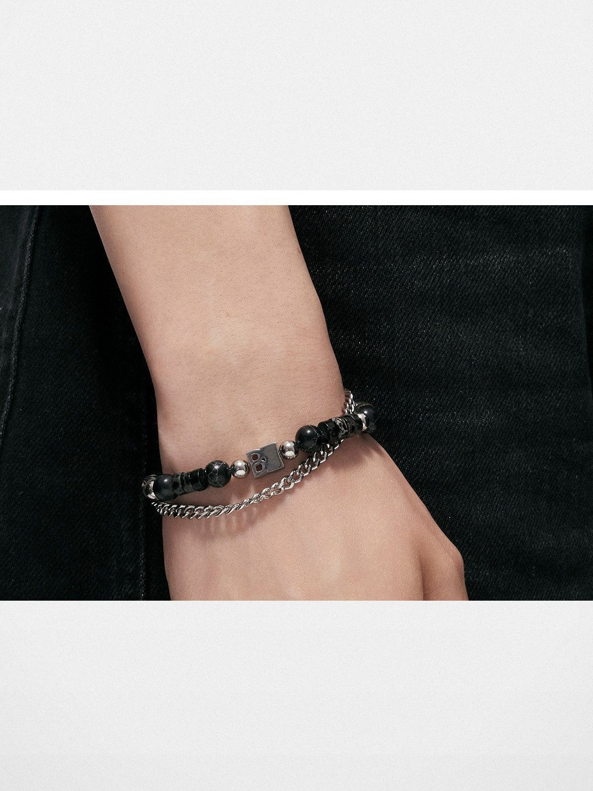 BLACKHEAD's double-layer bracelet in 316/304 stainless steel, synthetic turquoise, and Shoushan stone. Features a curb chain strand alongside mixed beads, a central logo tag, and an adjustable extension chain.