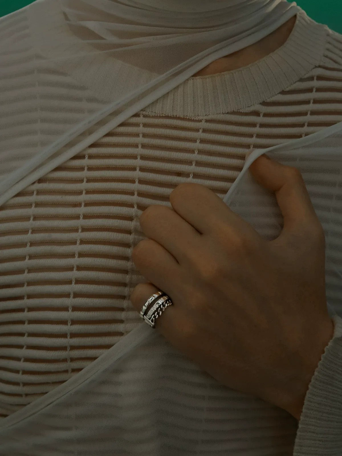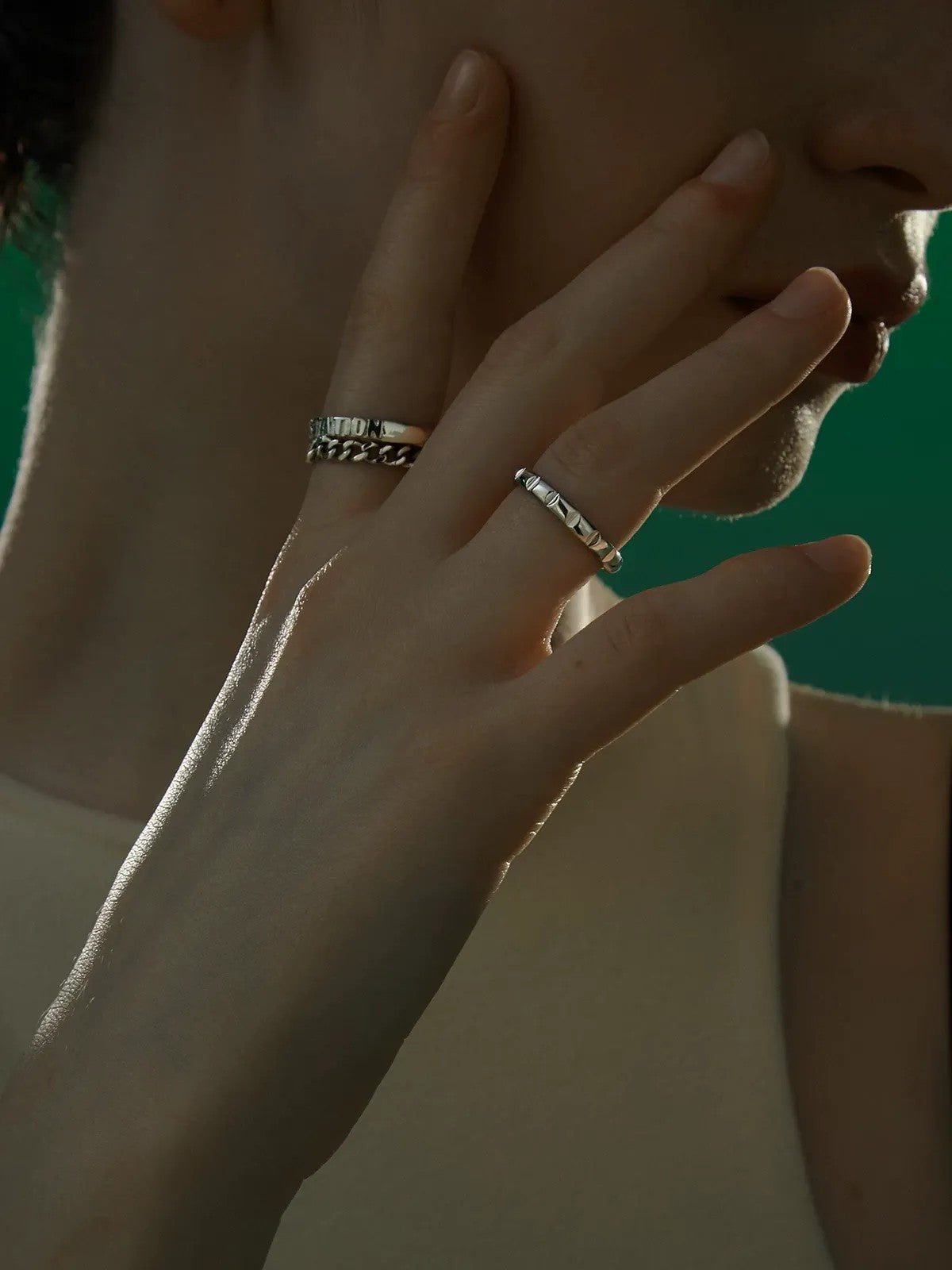 The Stackable Chain Logo Bar Ring Set in Silver — a ring from BLACKHEAD. He Feng's jewelry-designer eye for detail defines every BLACKHEAD piece. BLACKHEAD has built a devoted following among those who want their streetwear darker and more expressive.