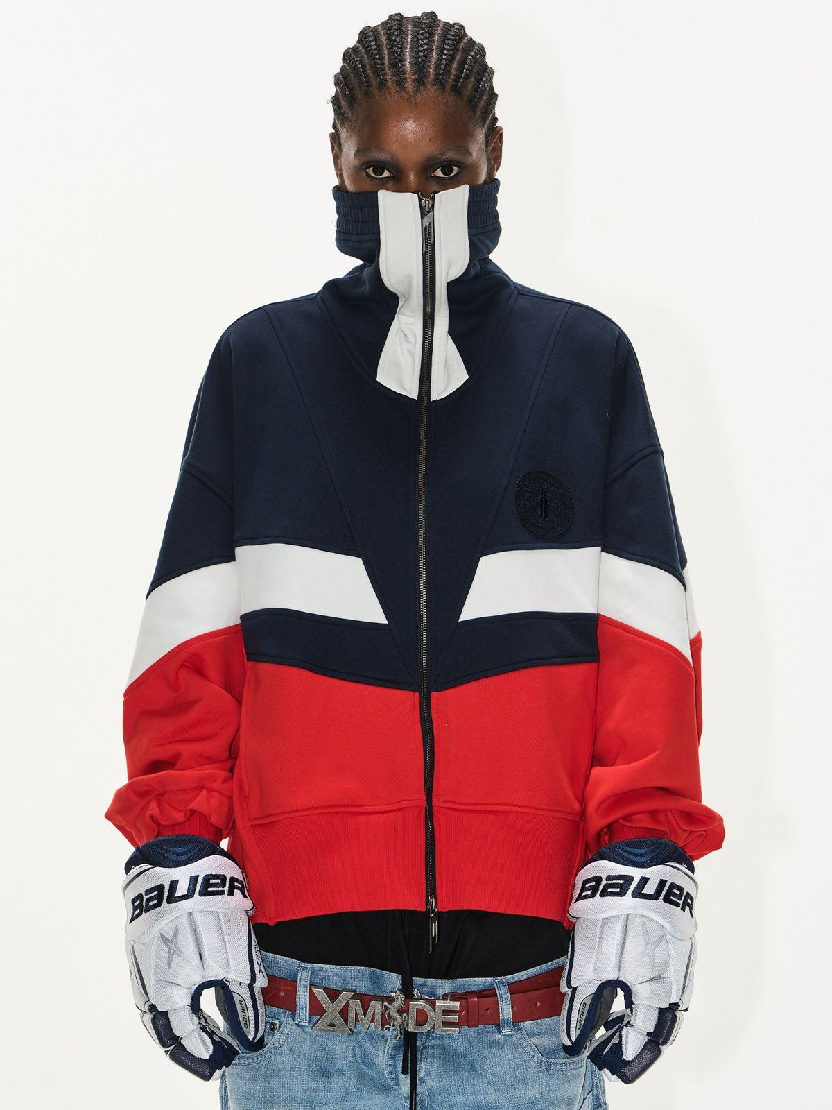The Color Block Ruched High Neck Sweatshirt in Blue — a sweatshirt from BLINDNOPLAN. Leo's BLINDNOPLAN rejects the predictable in favor of the unexpected. BLINDNOPLAN's refusal to follow trends has paradoxically made them one of China's most watched labels.