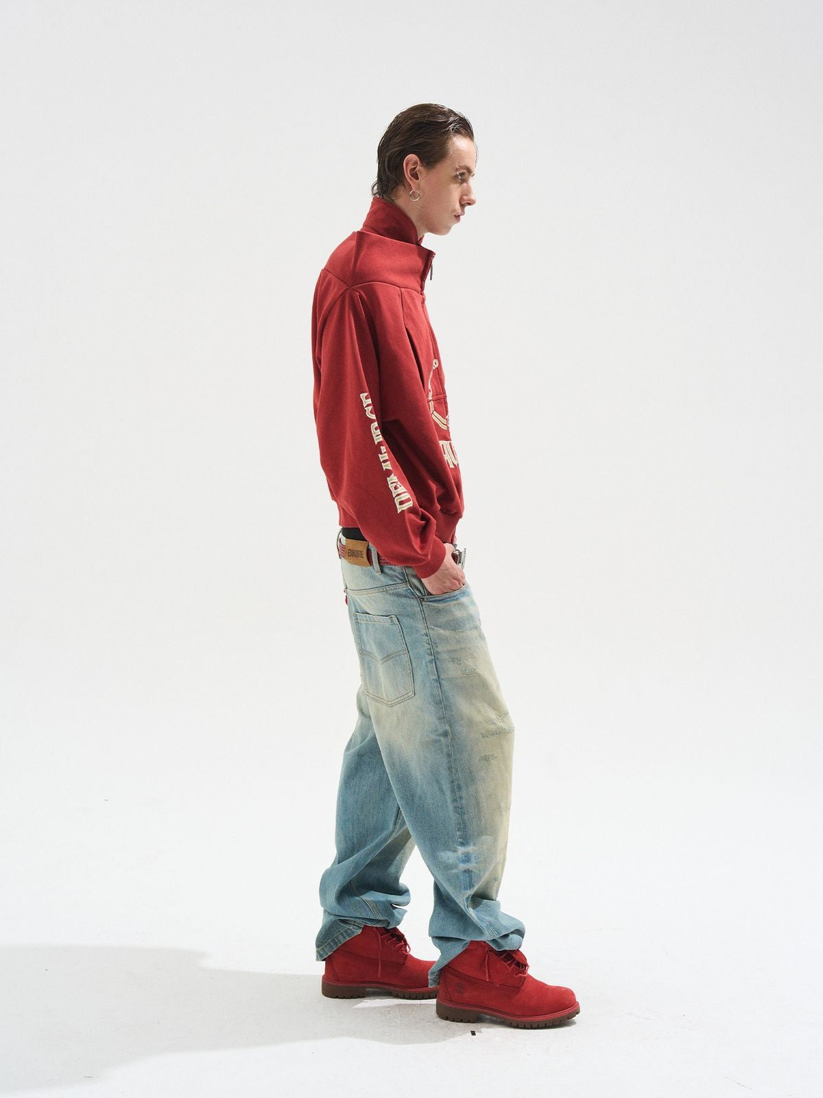 The Inverted Off Shoulder Zip Jacket in Red — a jacket from BLINDNOPLAN. Leo's BLINDNOPLAN rejects the predictable in favor of the unexpected. The label has attracted a following among those who want their streetwear to challenge, not conform.