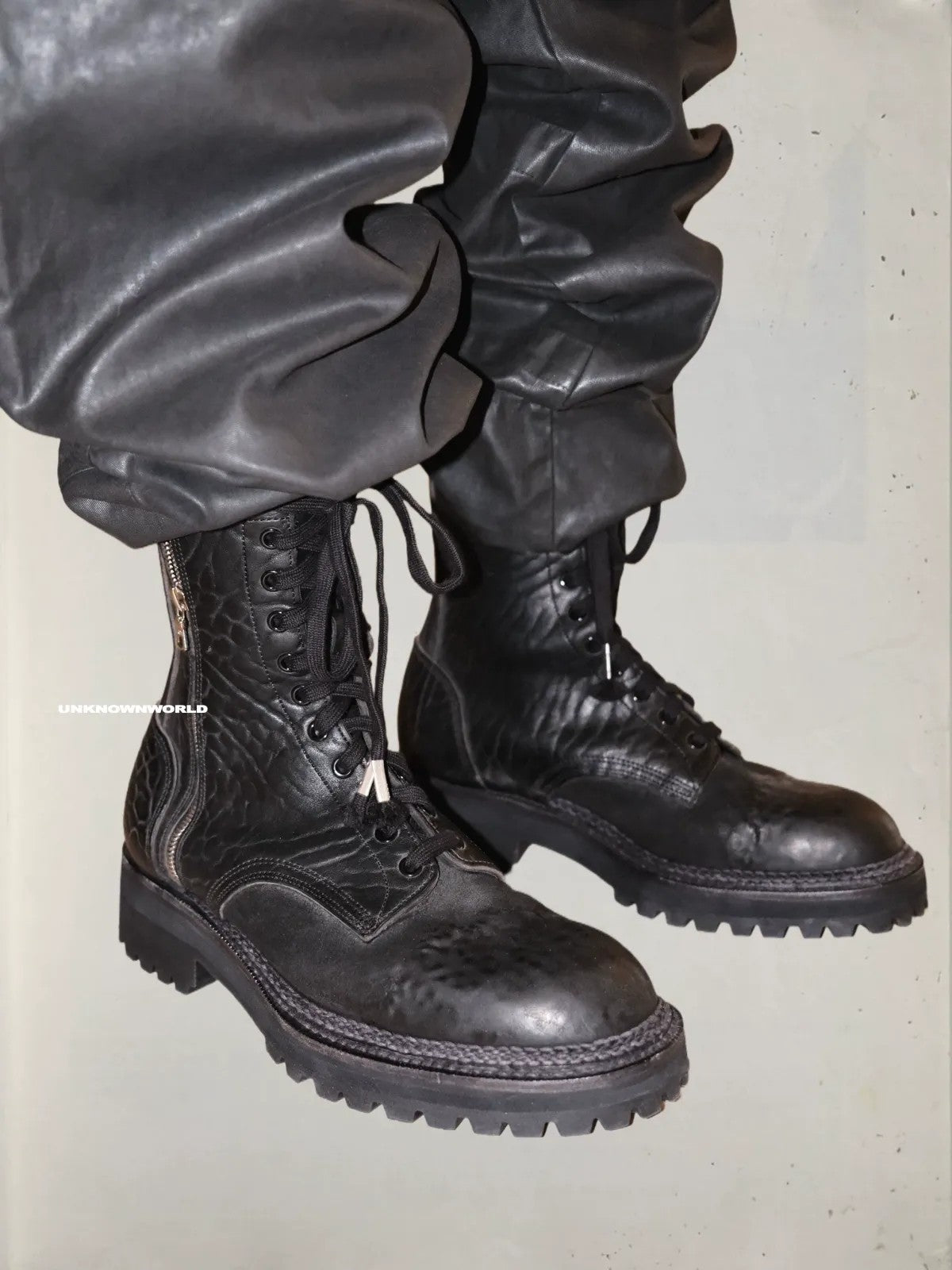 UNKNOWNWORLD's handcrafted boots in Maryam horse hindquarter leather. Features Norwegian welt construction, lace-up front with side zipper closure, and a heavy lug sole.