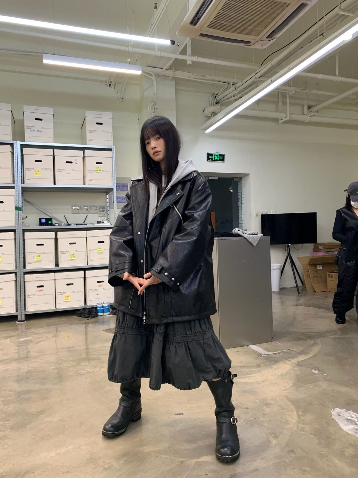 NeverSeez's mid-length coat in shiny viscose-PU blend leather. Features large notch lapels, a diagonal chest zipper, and spacious flap pockets. Insulated with polyester filling.