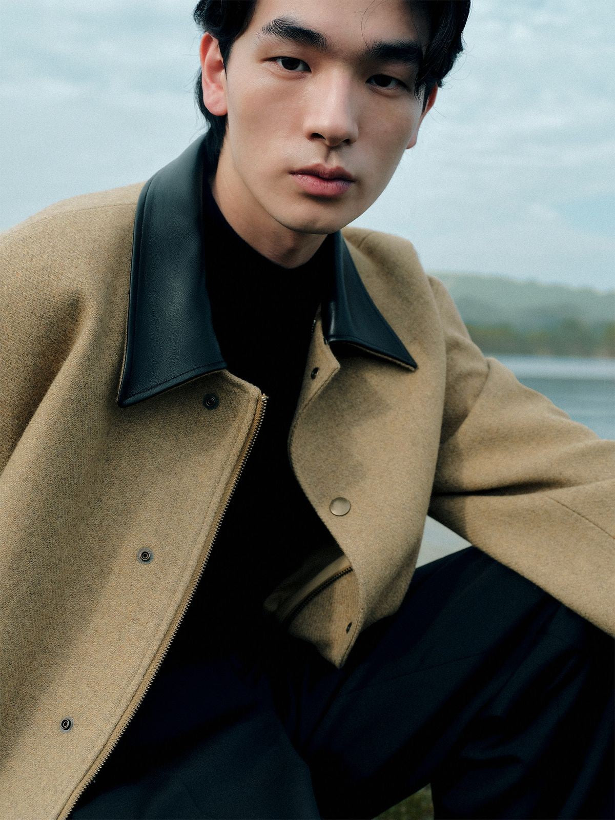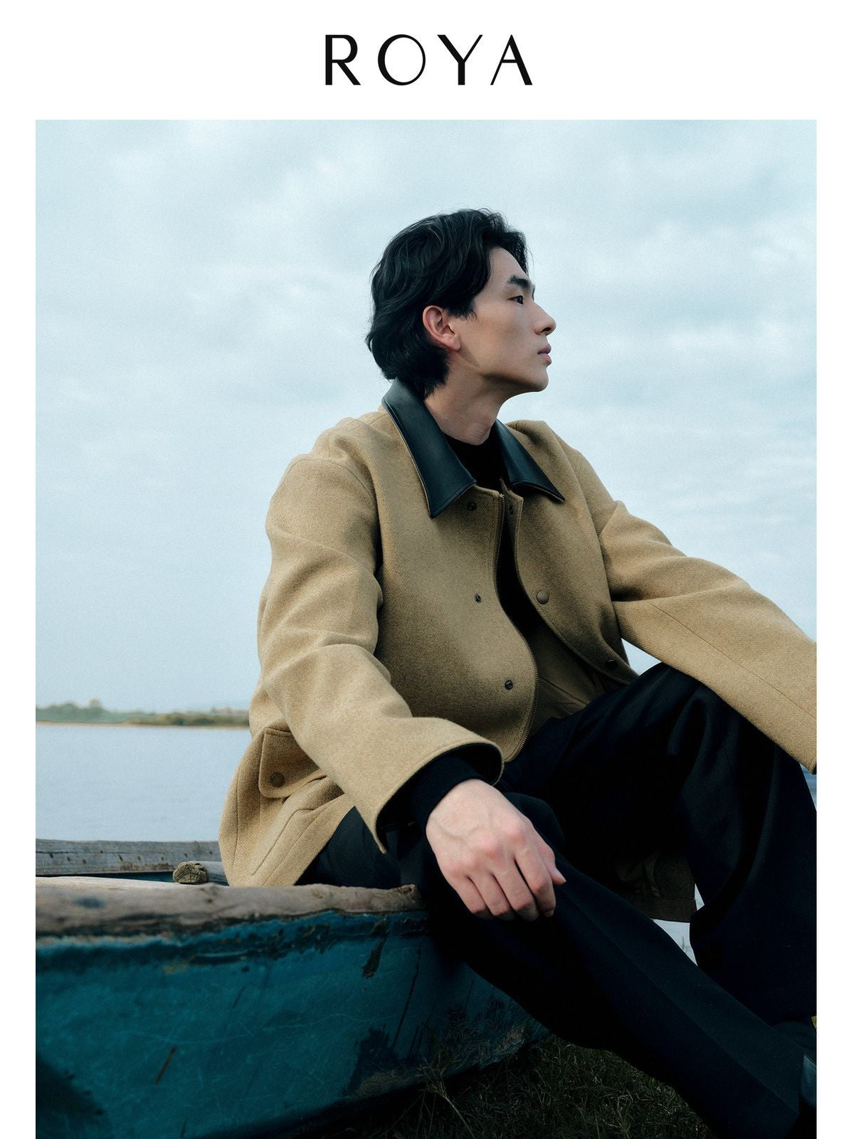 ROYA's heavyweight safari jacket in a 50% wool, 50% polyester blend. Contrasting sheepskin leather collar, concealed front placket, inverted back pleat.