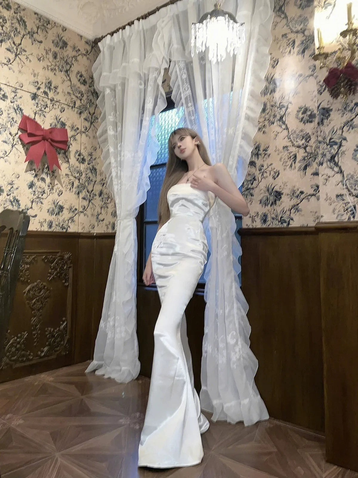 The construction quality sets it apart: Strapless gown in high-gloss acetate satin. Features a structured bandeau neckline, figure-hugging bodice, and voluminous floor-length mermaid hem. From the cut to the finish, every detail is considered — the kind of dress that becomes a go-to.