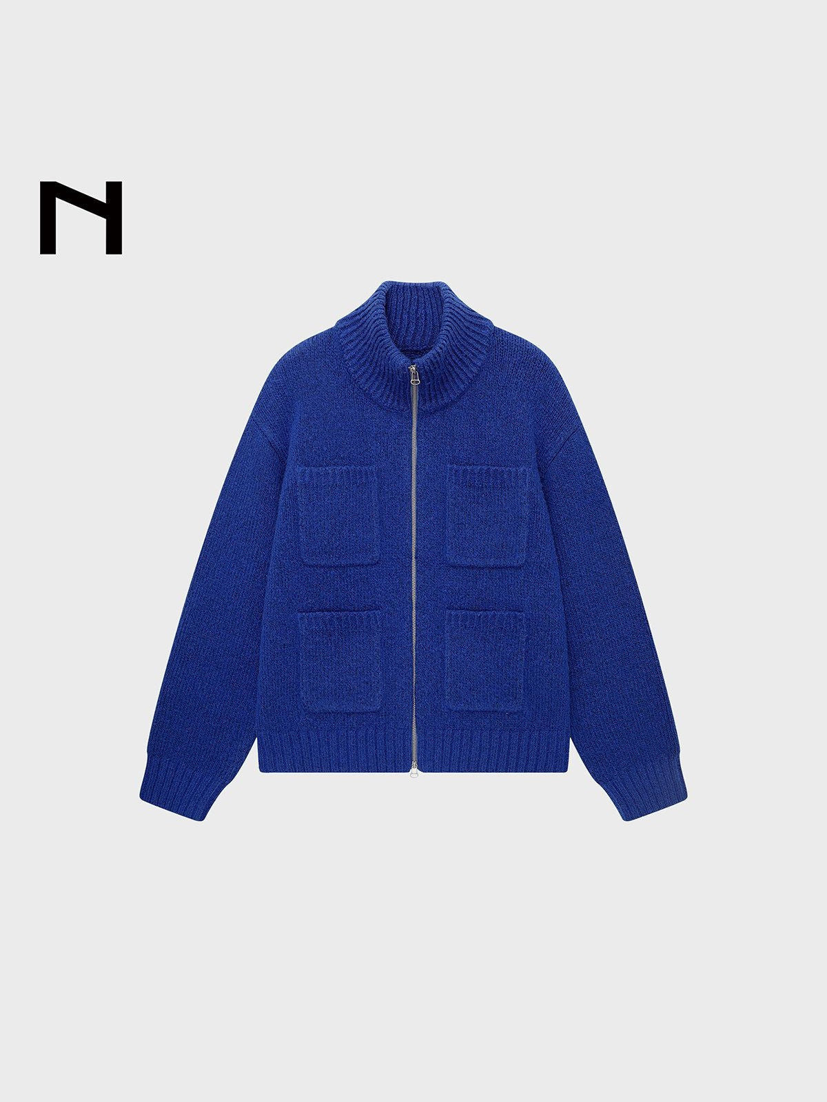 NANS's ribbed cardigan in a heavyweight lamb wool and alpaca blend. High stand collar, two-way zip closure, and four front patch pockets.