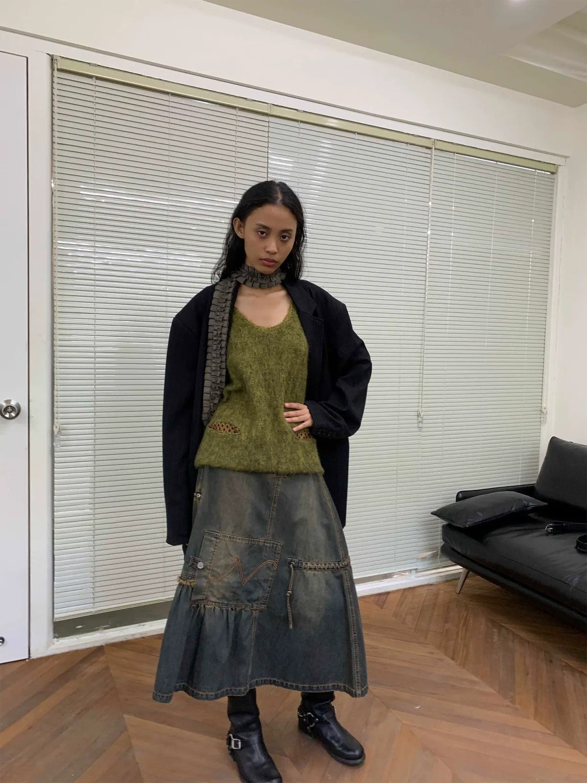 Familiar foundation, unexpected execution: Asymmetric skirt in 100% cotton denim. Heavily washed for a vintage look, featuring panel construction, raw edge detailing, and a gathered ruffled hem. The drape and construction reflect a level of care that shows in how it moves and wears throughout the day.