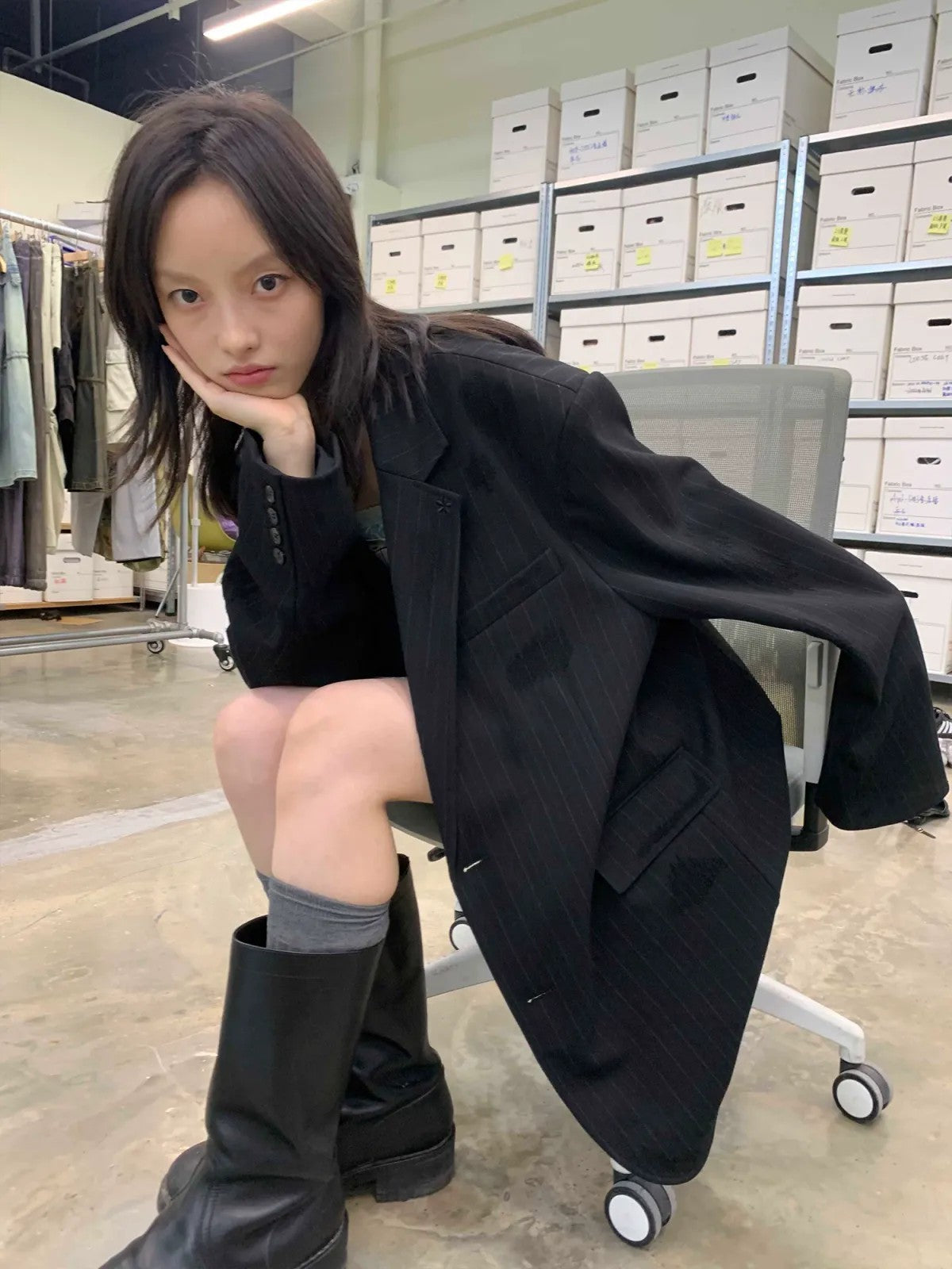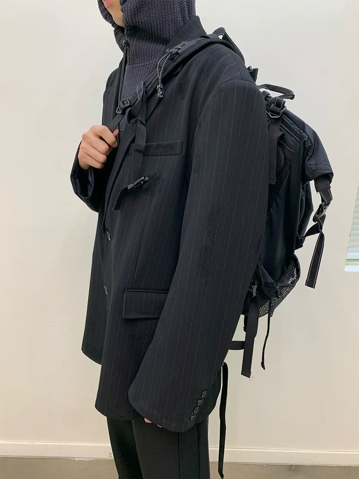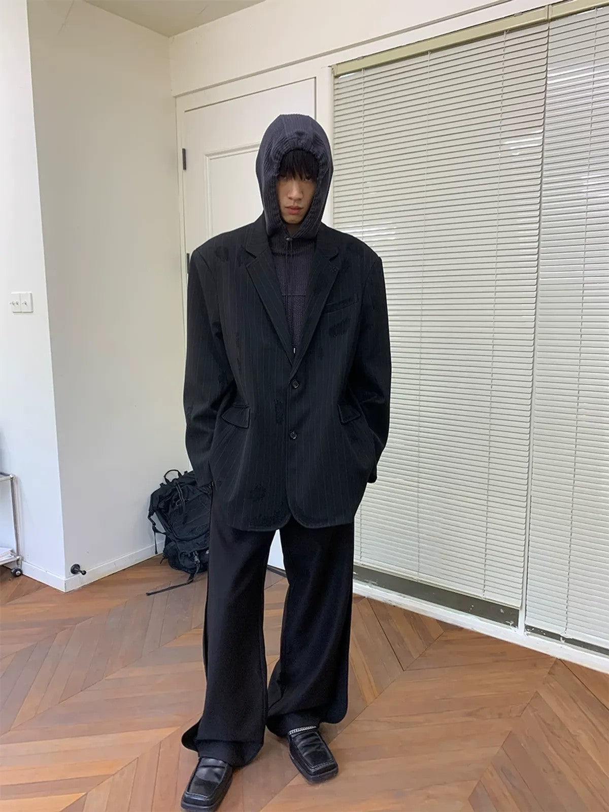 The reimagined approach shows in the construction details: Oversized blazer in a polyester-rayon blend. Notched lapels, flap pockets, and hand-distressed embroidery create a textured, lived-in finish. The fabric, collar shape, and stitching quality put this in a different category from fast-fashion alternatives.