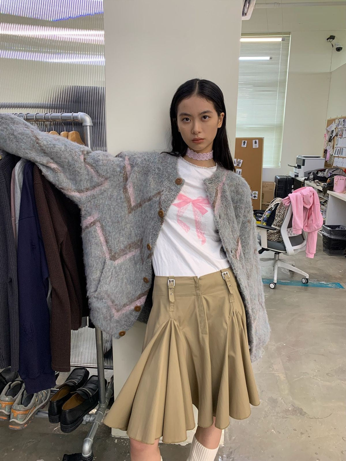 The Plush Wool Blend Lantern Cardigan in Gray — a women's cardigan from NeverSeez. From the label that finds fresh angles on familiar design foundations. Their consistent quality and creative reinterpretation have made them a reliable name in Chinese streetwear.