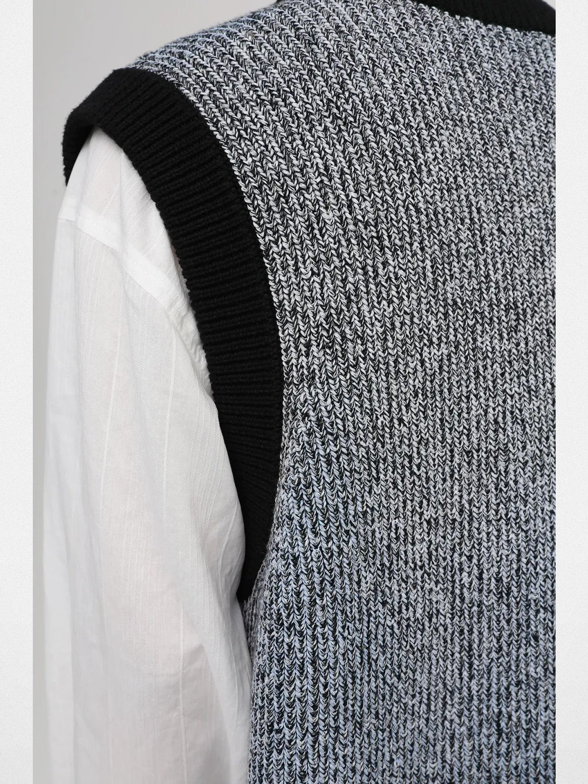 MASONPRINCE's relaxed vest in a textured melange knit. Deep V-neck, contrasting ribbed trims at the collar and armholes, and a straight hem.