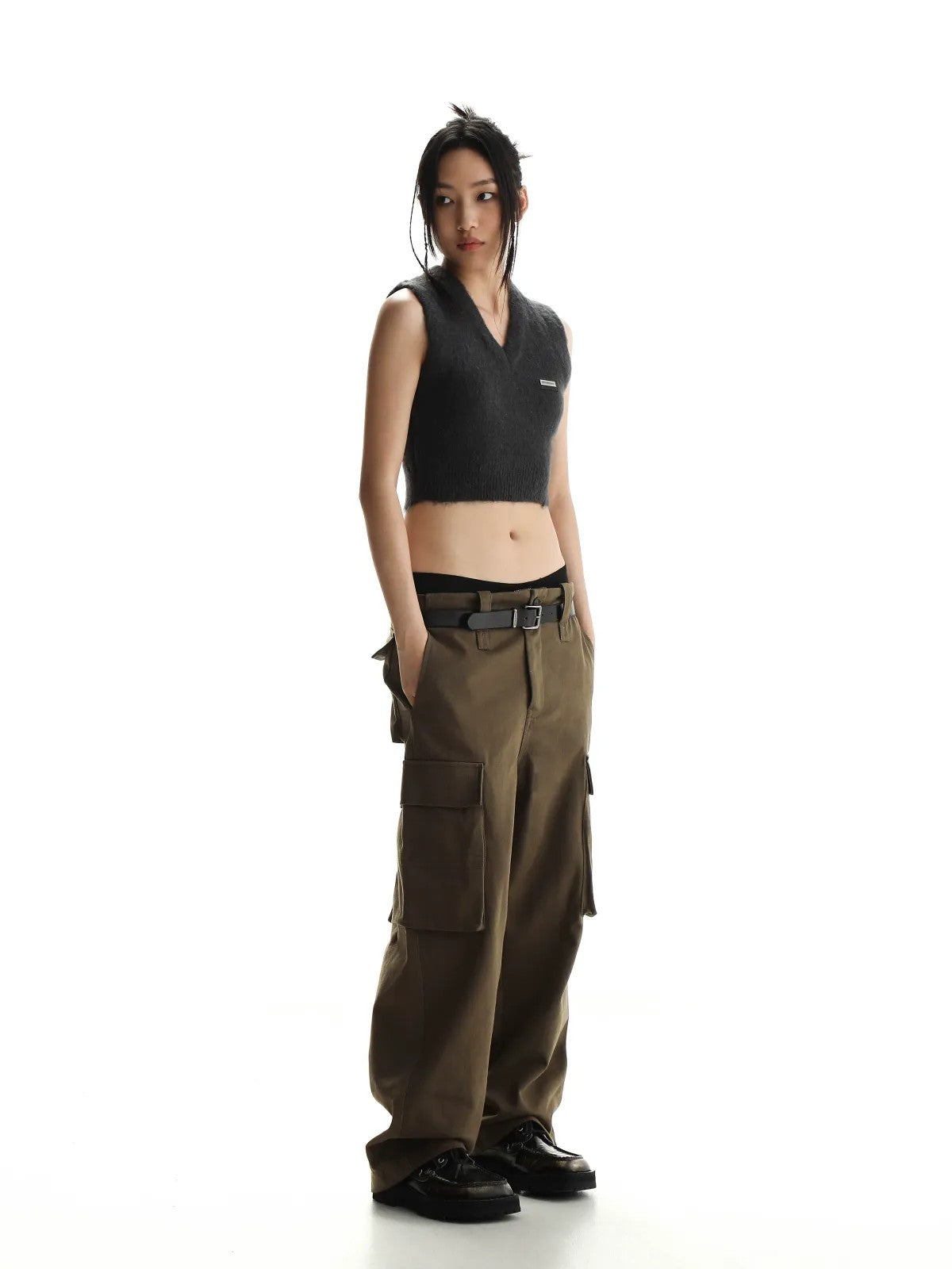 MASONPRINCE's cropped sweater vest in a fuzzy knit blend enriched with mohair and wool. Deep V-neckline, ribbed trims, and signature metal logo hardware.