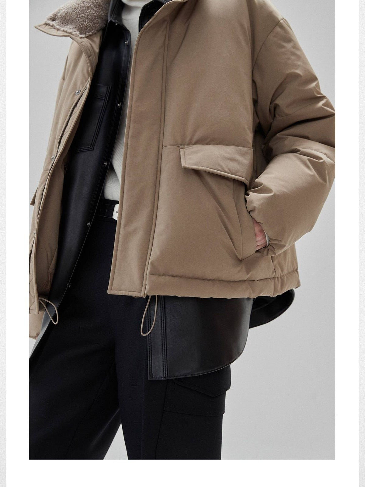 NANS's short puffer in 90% white goose down with a polyester shell. Sherpa-lined high collar, stacked front flap pockets, concealed zip and snap closure.