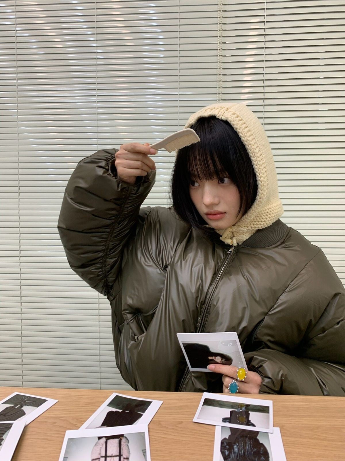 NeverSeez's cropped puffer in 100% polyester with 90% white duck down fill. Ruched detailing along the sleeves, high stand collar, and zip closure.