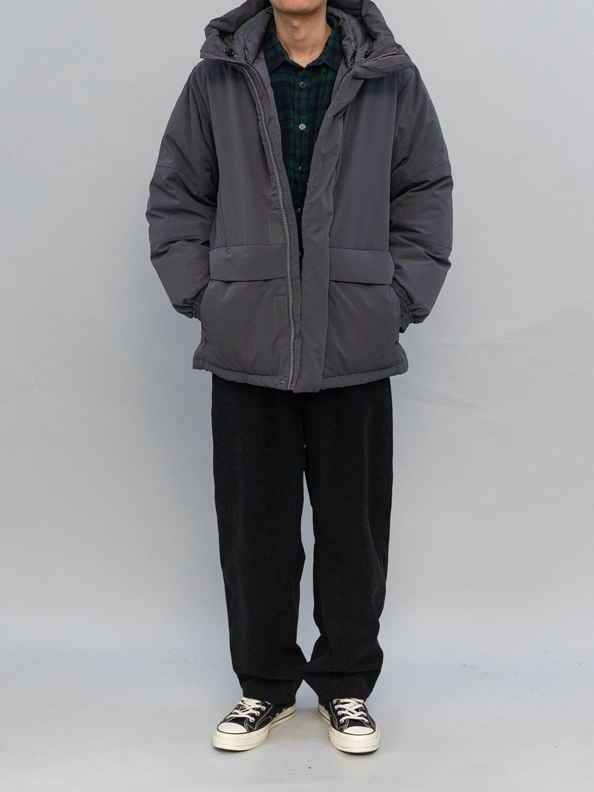 Soda's mid-length puffer in 90% duck down with 250g fill. Features a high-neck hood, concealed front placket, and dual flap pockets at the waist.