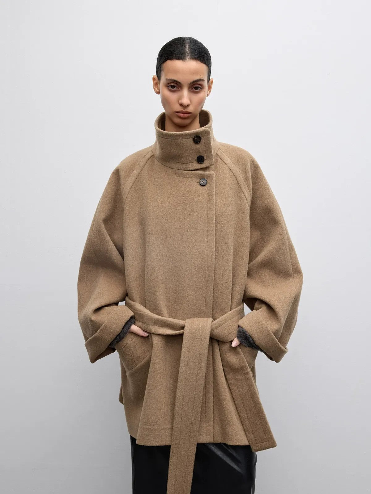 RandomPiece's short coat in a 92.6% wool and 7.4% alpaca blend. High stand collar, button front closure, wide sleeves, and a self-tie waist belt.
