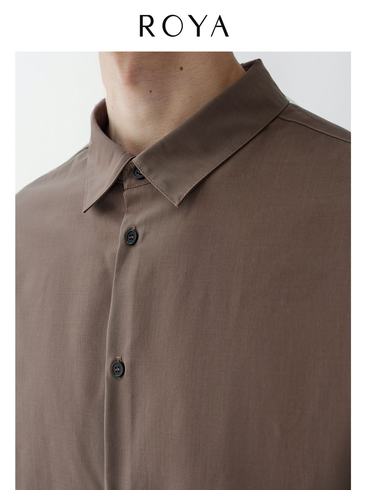 ROYA's minimalist button-up in a smooth polyester and Australian Merino wool blend. Small point collar, contrasting front closure, and buttoned cuffs.
