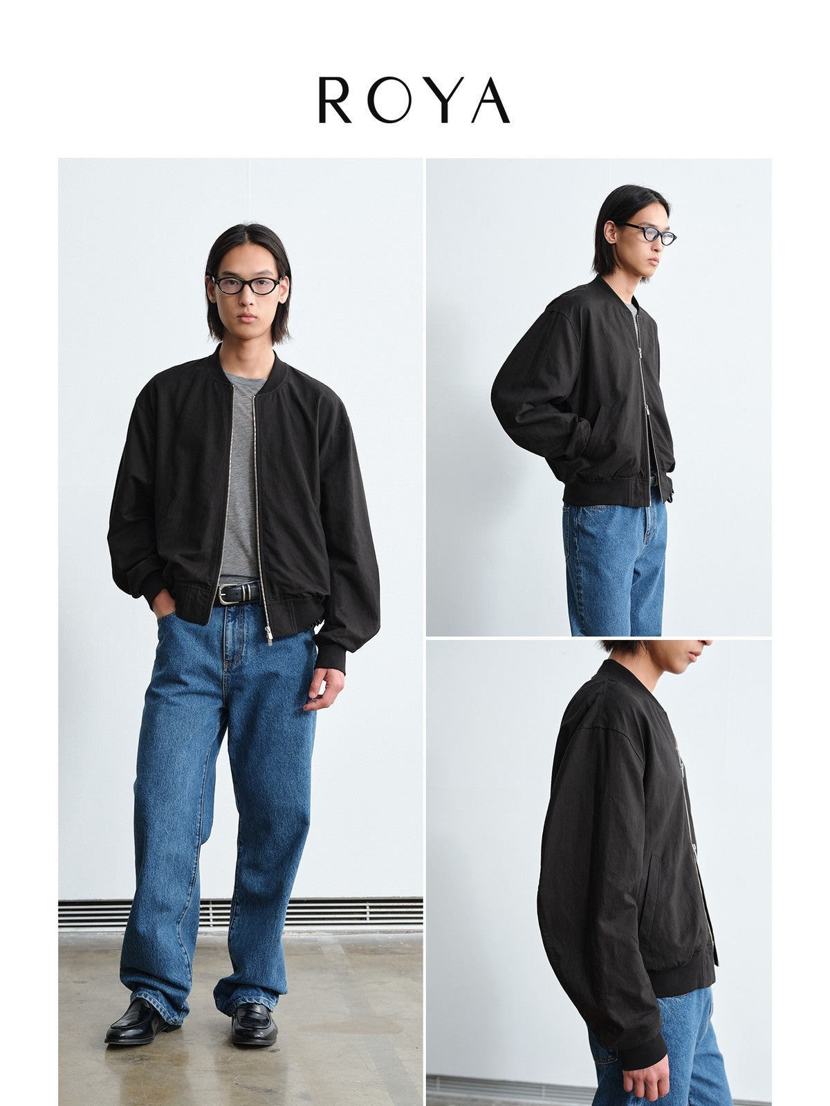 ROYA's MA-1 bomber in a tactile linen, wool, and cotton blend. Features articulated curved sleeves, cotton ribbed trims, and a central zip closure.