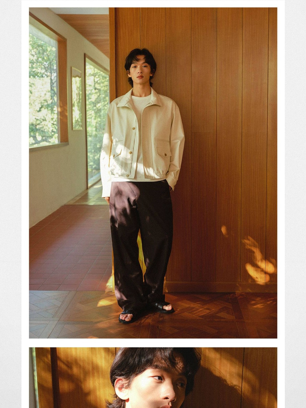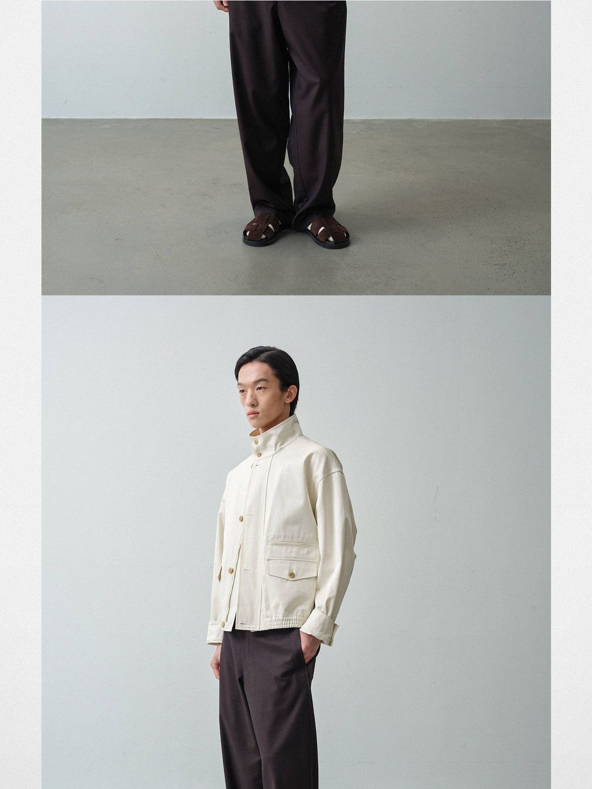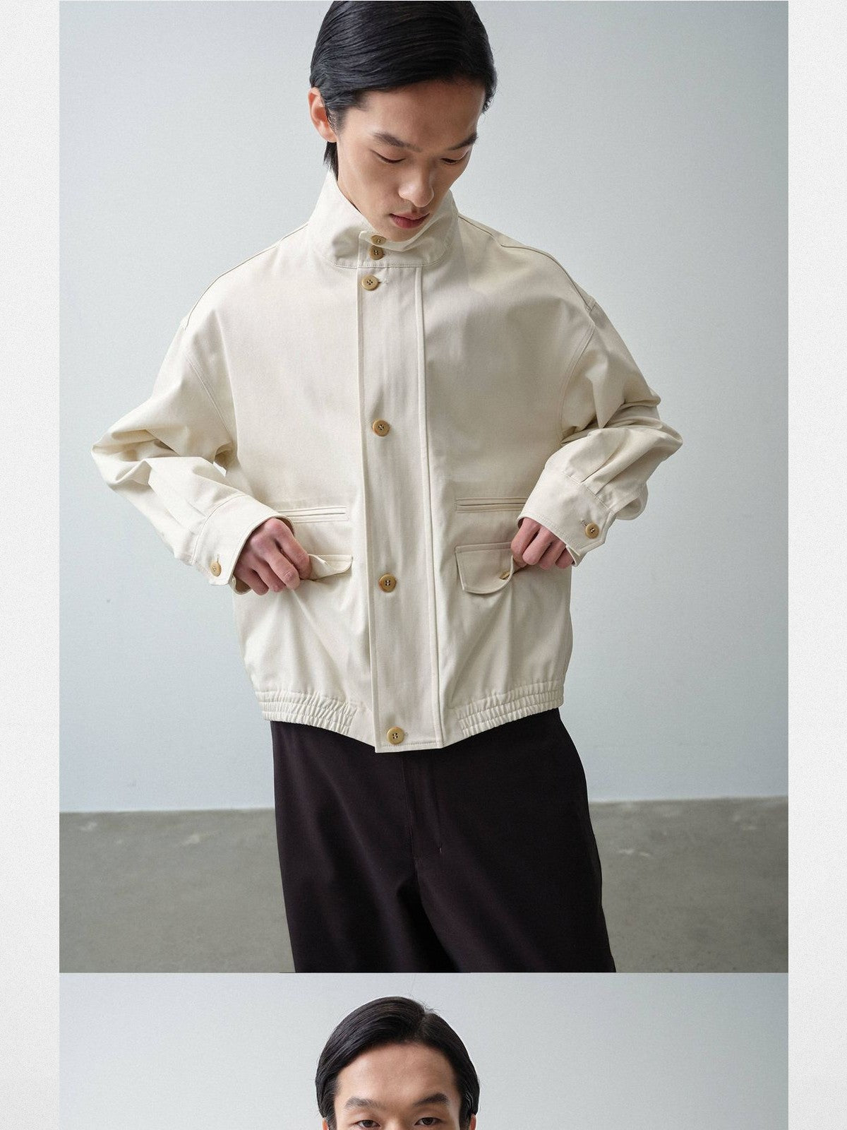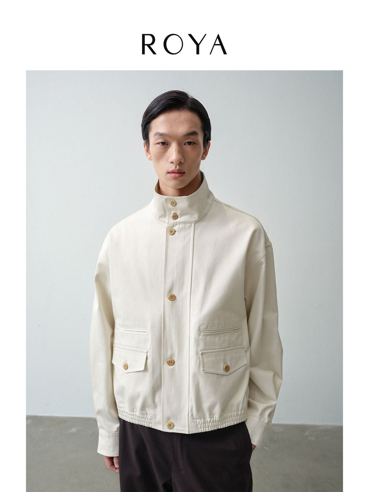 ROYA's Harrington jacket in water-repellent high-density cotton twill. High stand collar, accordion flap pockets, concealed placket, elasticated hem.