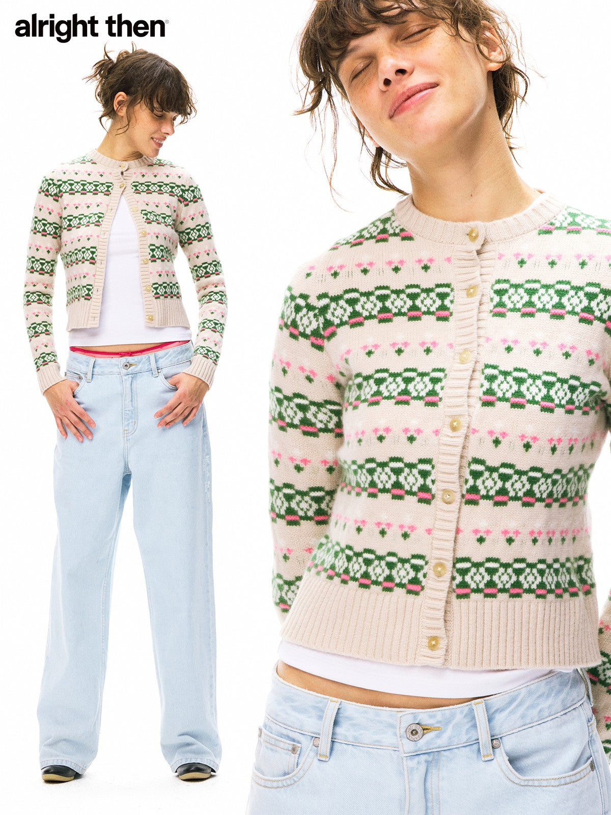 The 100 Wool Jacquard Cardigan in Brown and Beige — a women's cardigan from Alright Then. An independent Chinese label bringing fresh perspective to streetwear. Their commitment to quality and distinctive design has built a growing international following.