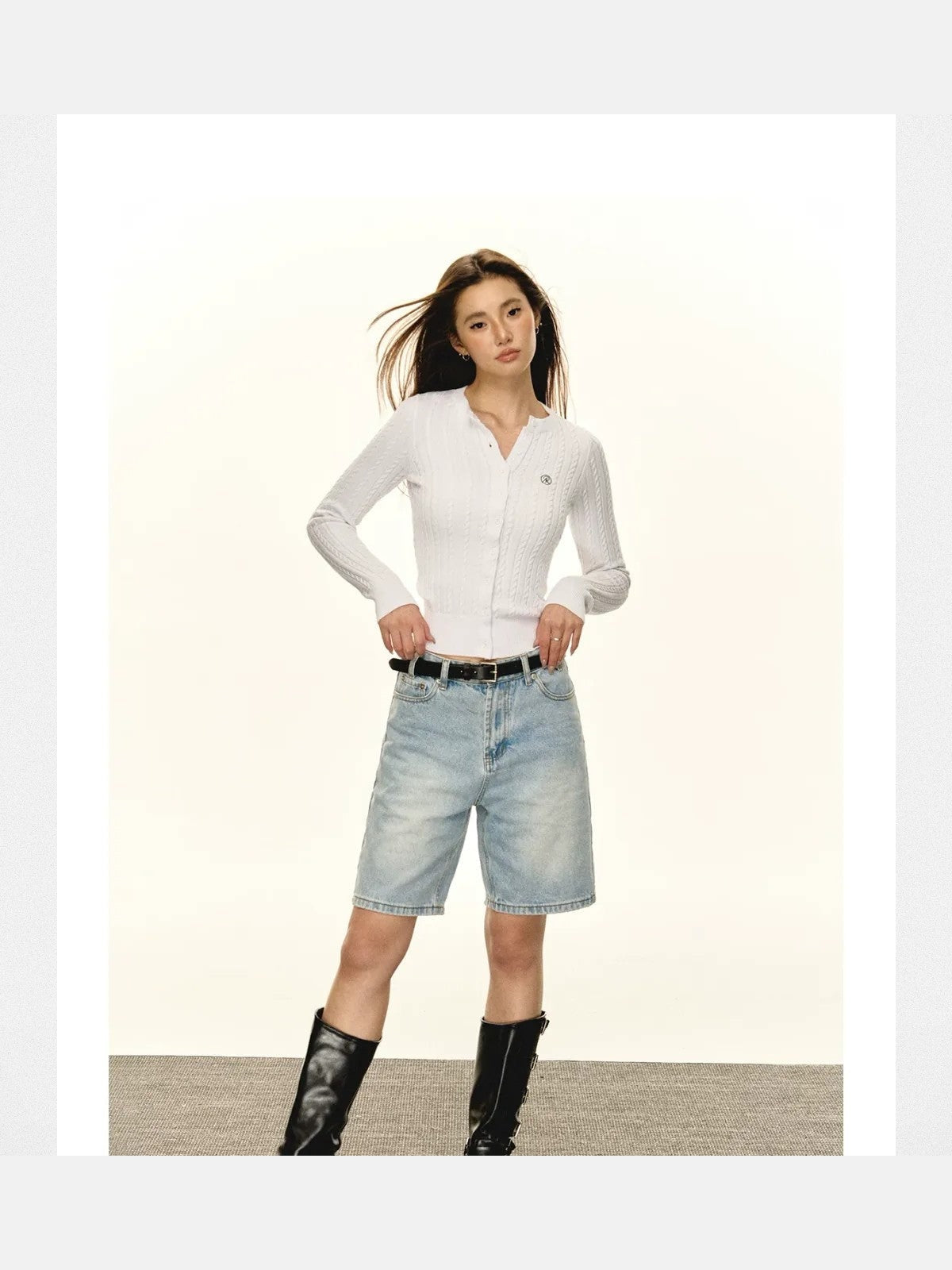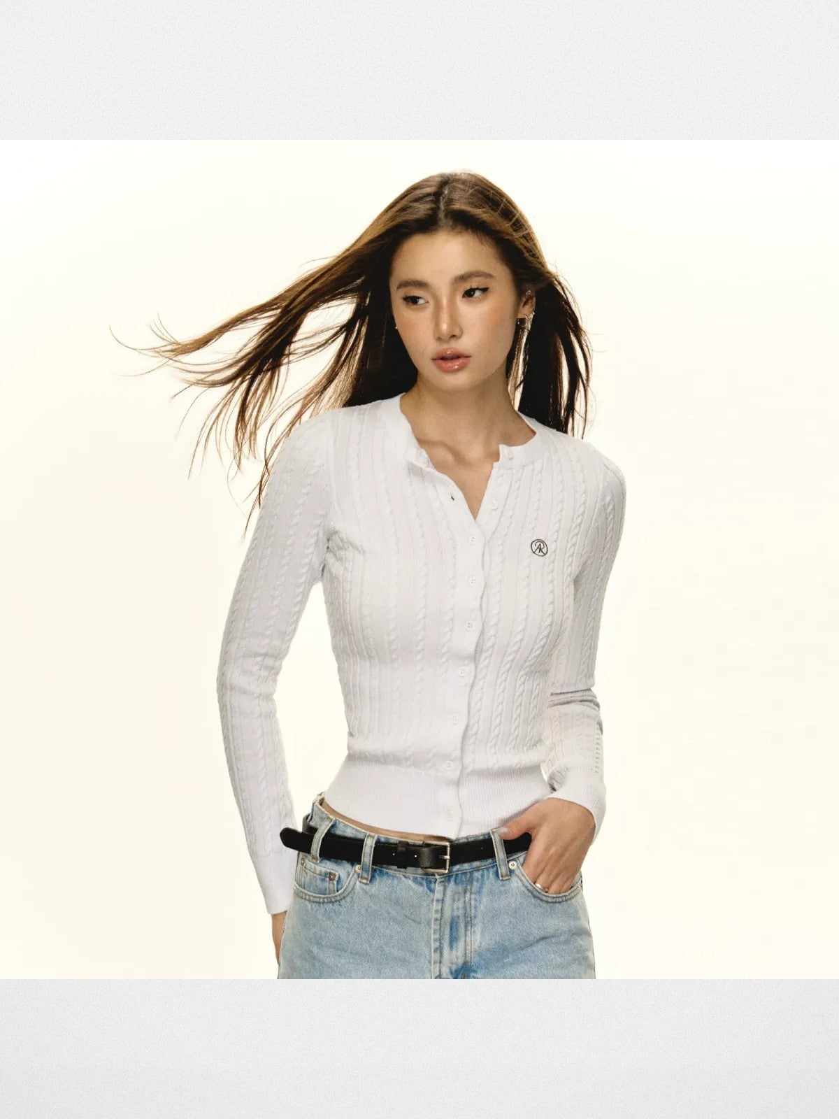The Slim Cable Knit Cardigan in Gray, White, Black, and Cream — a women's cardigan from ARISEISM. Personal yet powerful. ARISEISM creates pieces that feel both intimate and bold. Their pieces balance softness in detail with strength in silhouette, creating looks with real presence.