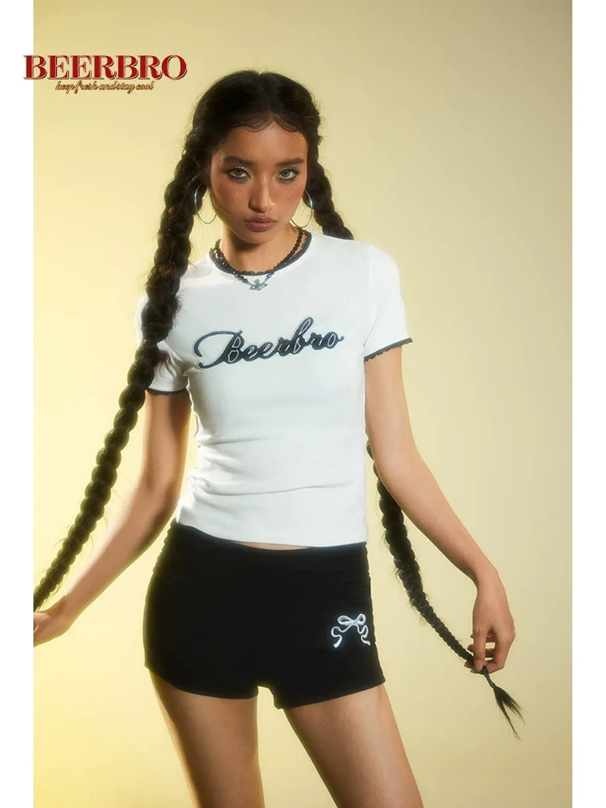 The Lace Trim Embroidered Modal Baby Tee in Black — a women's t-shirt from BeerBro. California surf and skate culture through a distinctly Chinese lens. Accessible pricing and easygoing design have built BeerBro one of the largest catalogs in Chinese streetwear.