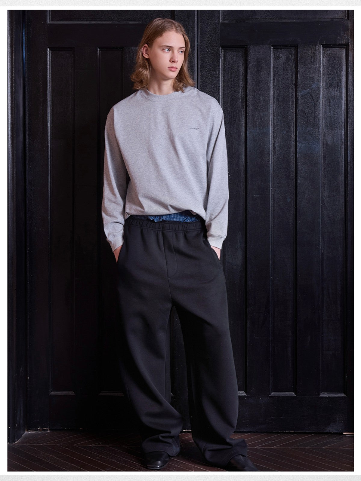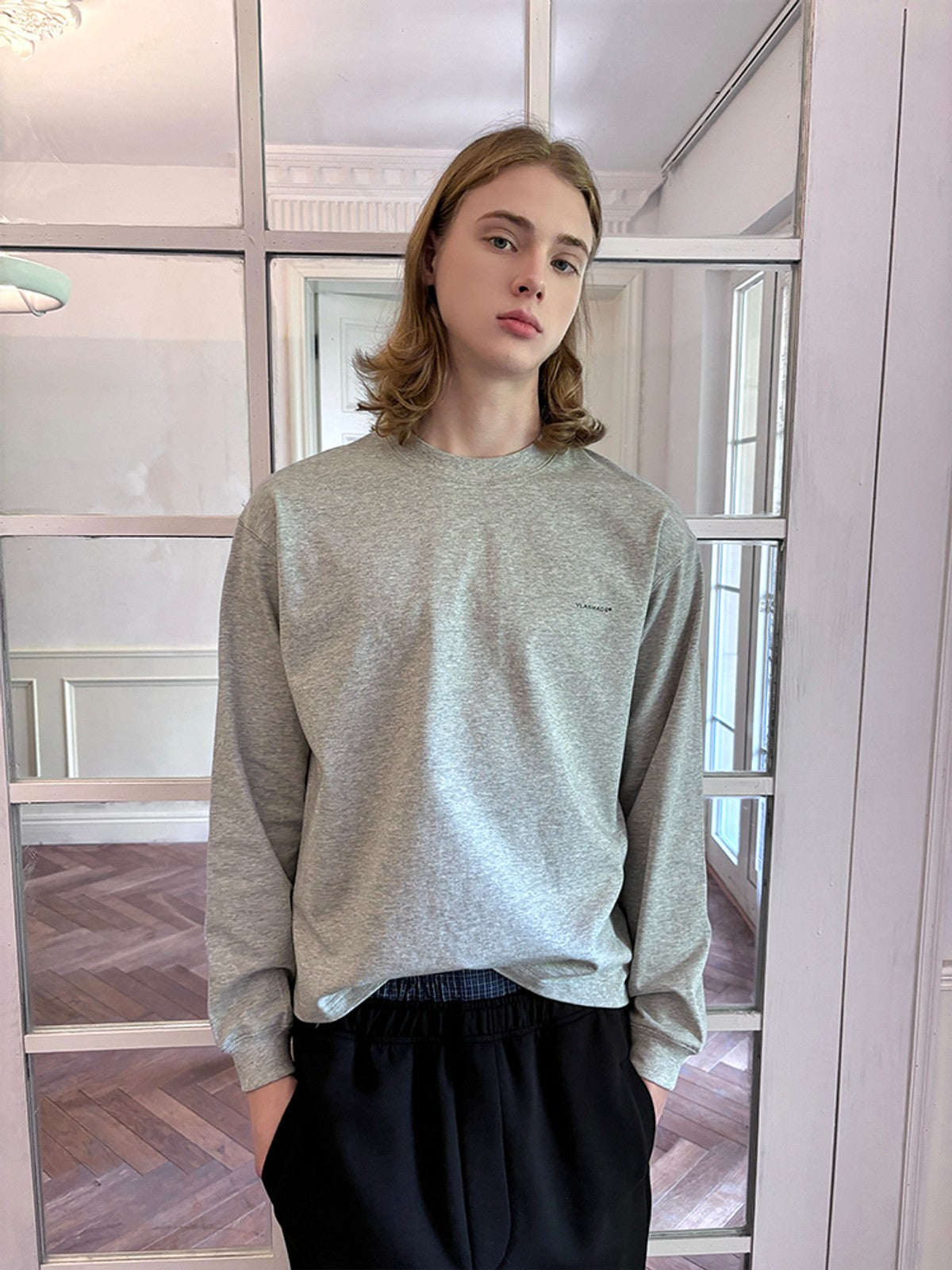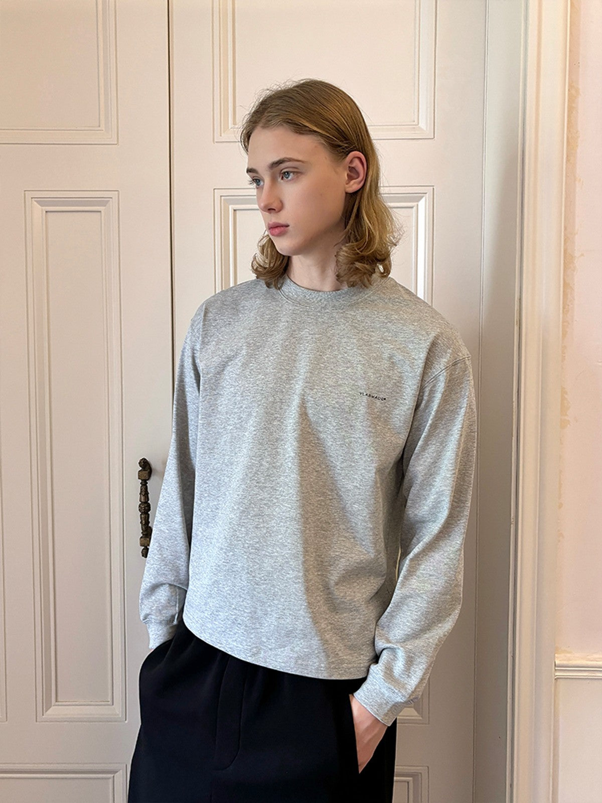 The Boxy Cotton Long Sleeve T Shirt in Gray and White — a men's t-shirt from VLABMADE. From the growing wave of Chinese designers making global impact. The label continues to gain recognition in China's vibrant independent fashion scene.