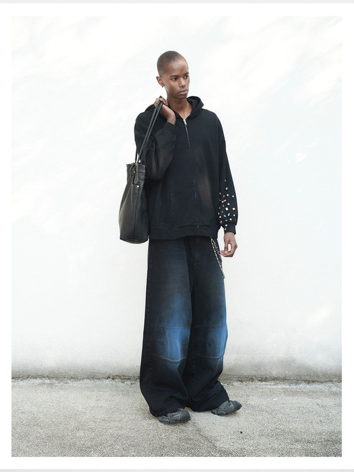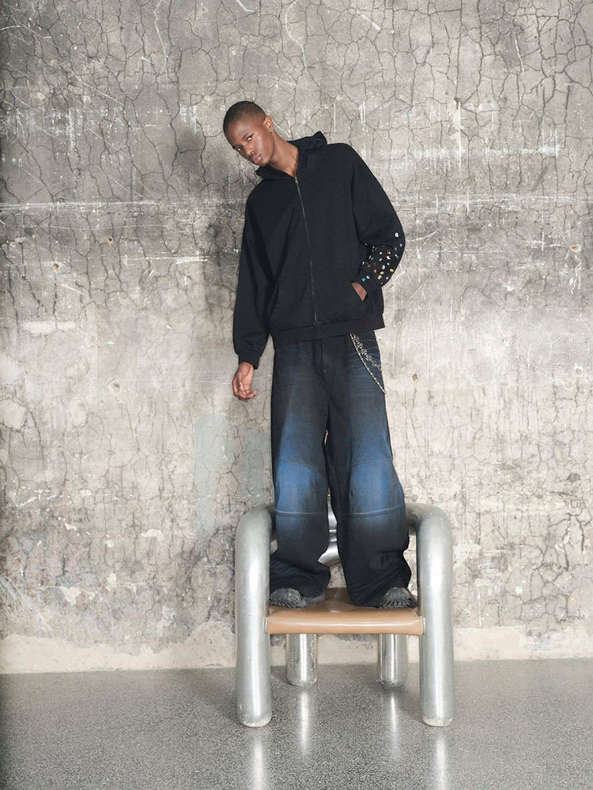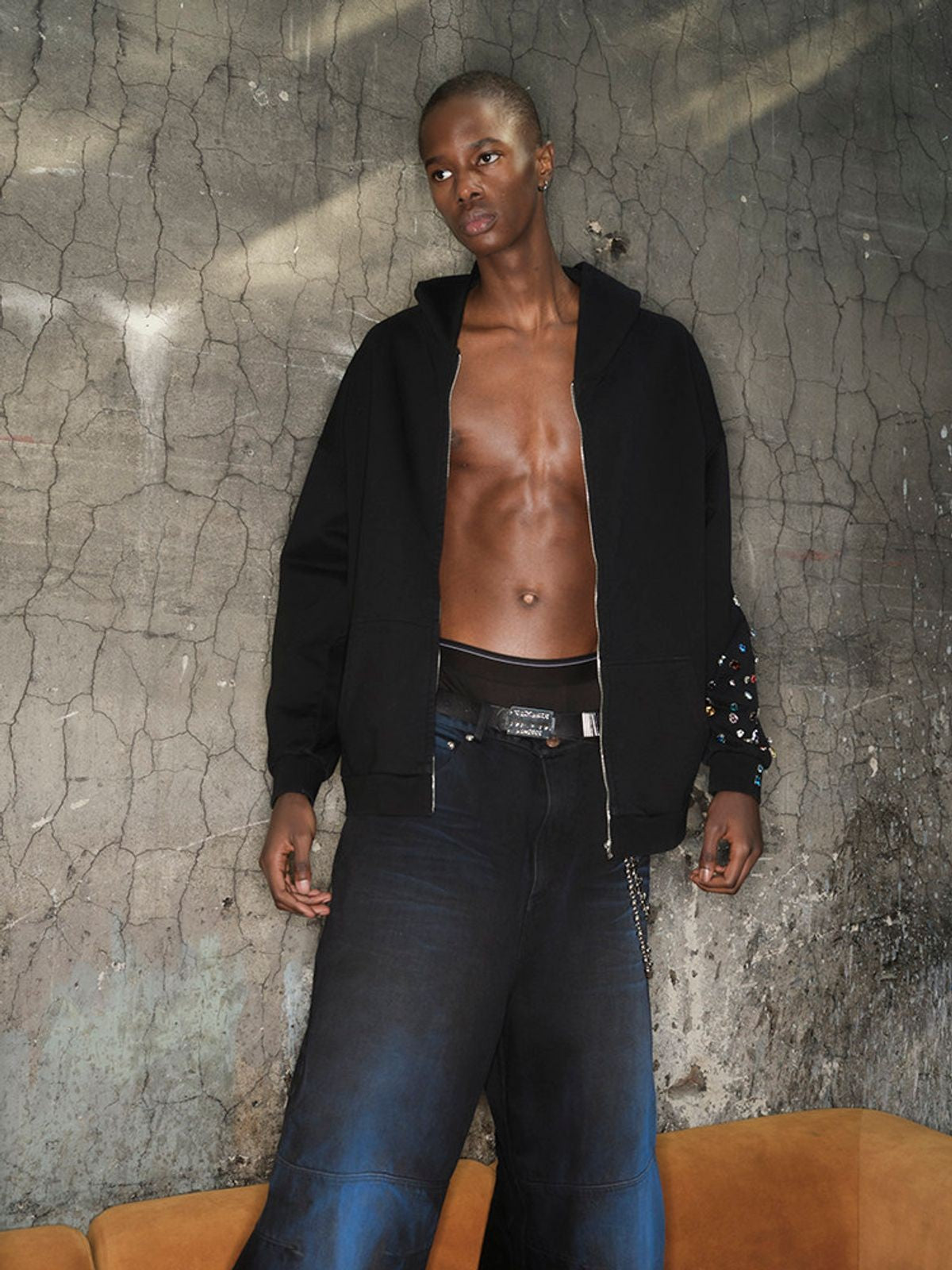 TRIANGLE PROJECT's oversized zip-up hoodie in 100% cotton. Detailed with multicolored gemstone embellishments on the sleeve, a split kangaroo pocket, and ribbed trims.