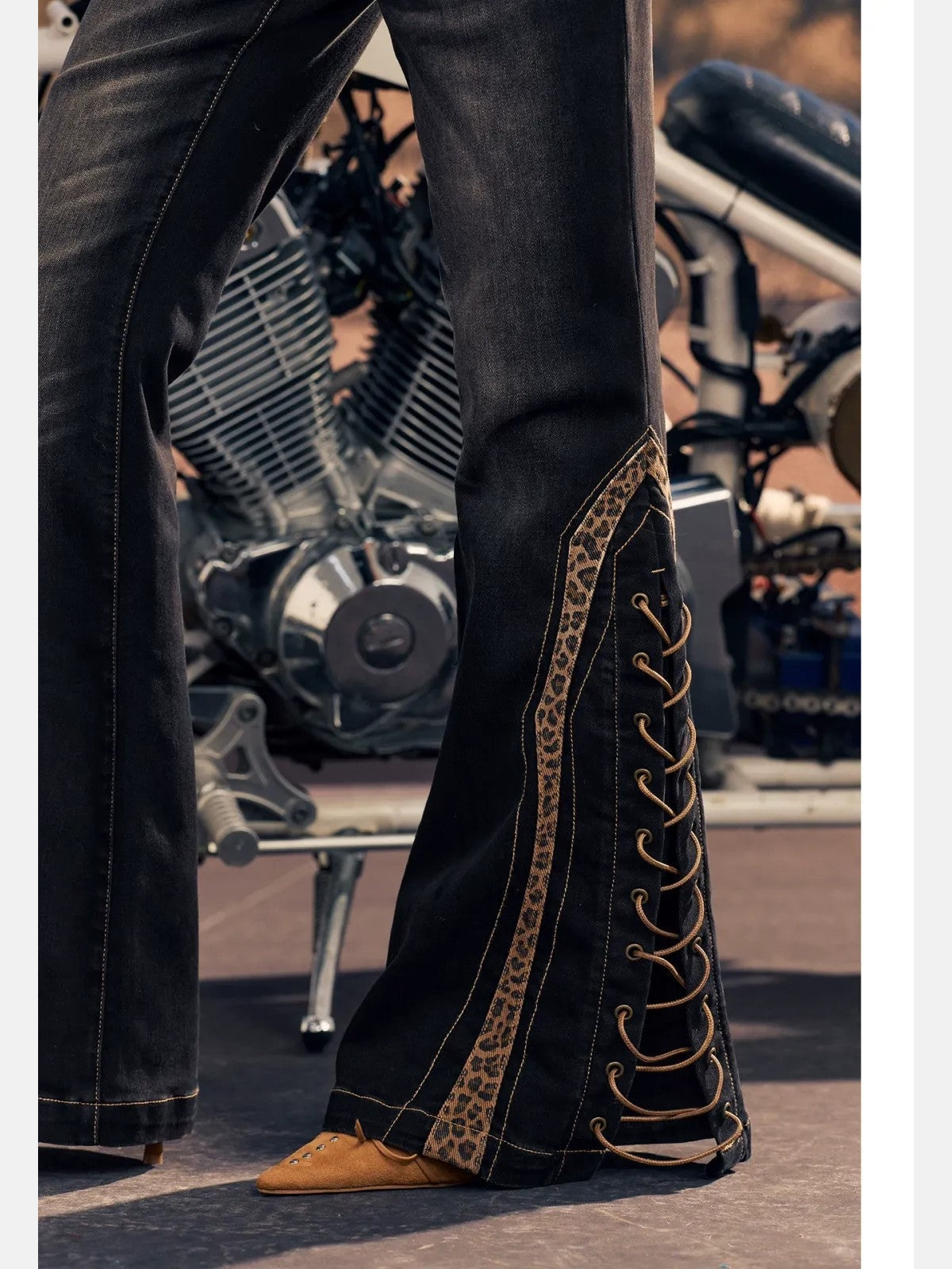 Leopard Panel Lace Up Flare Jeans