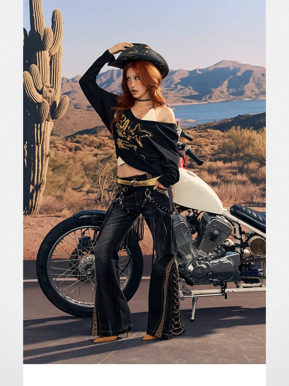 The Leopard Panel Lace Up Flare Jeans in Denim — a women's jeans from BeerBro. BeerBro channels the easygoing attitude of West Coast streetwear. Each piece captures the easy confidence of not trying too hard — harder to pull off than it looks.
