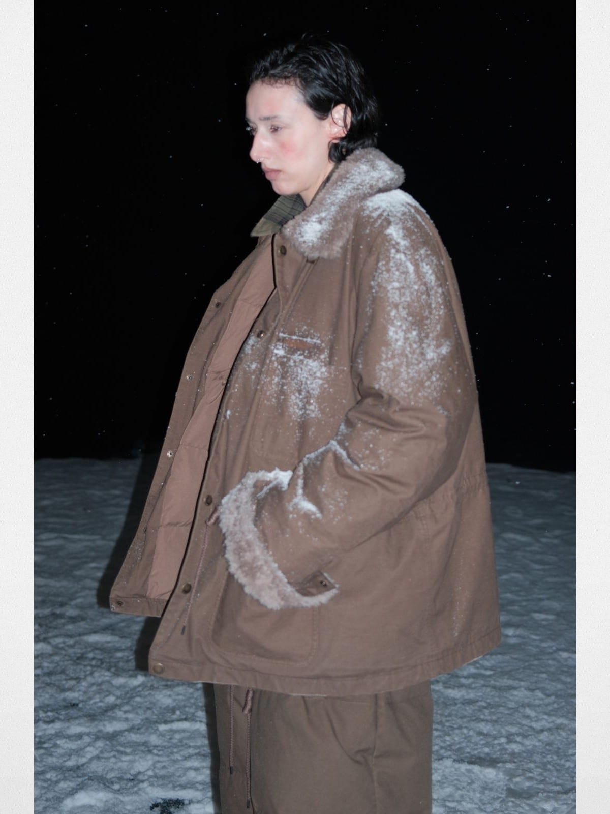 MasonPrince's workwear-inspired puffer in cotton canvas with white duck down fill. Features a 100% wool sherpa collar, internal drawstring waist, and multiple flap pockets with D-ring hardware.
