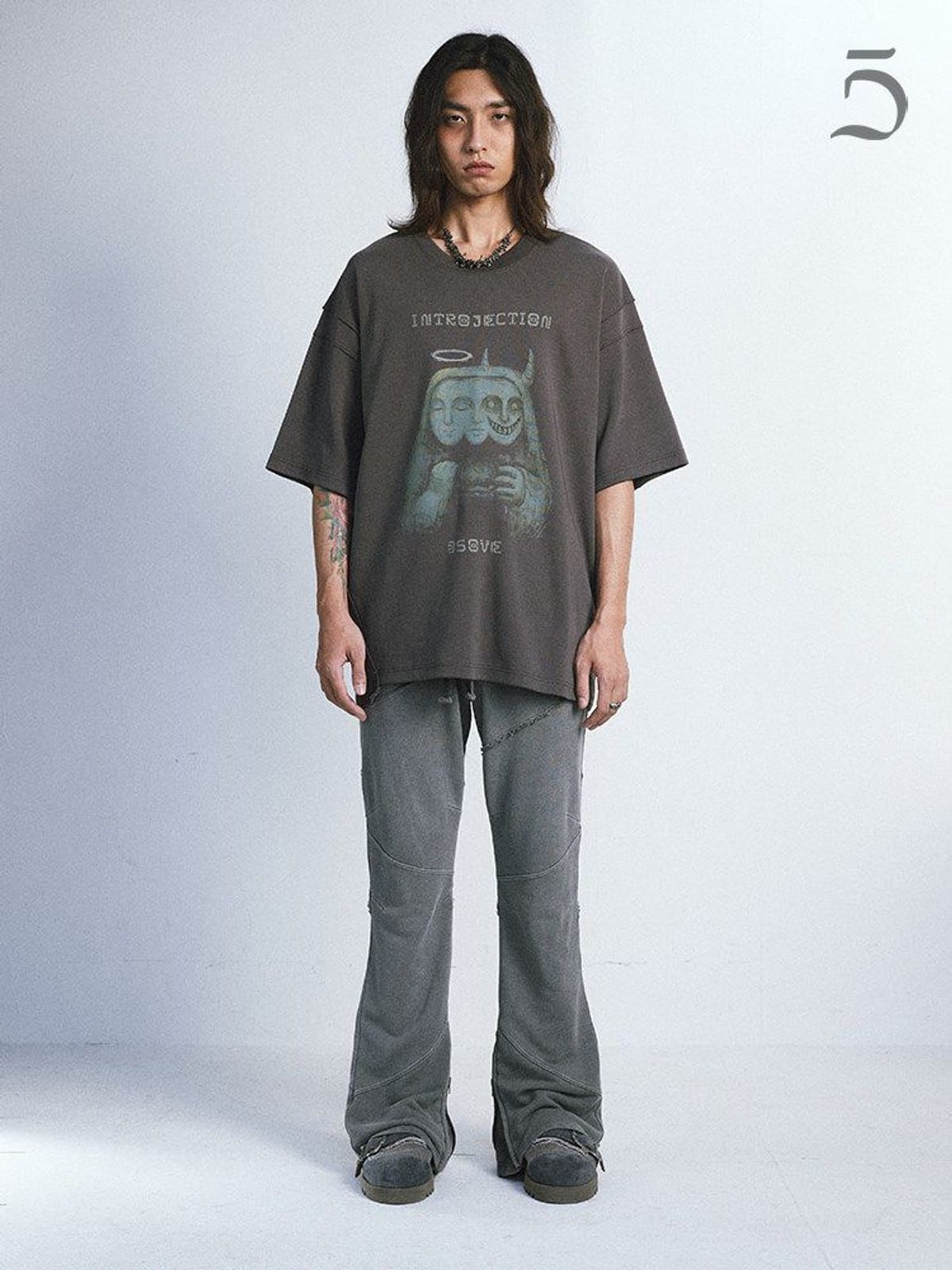 D5ove's structural trousers crafted in 100% cotton. Detailed with complex paneled leg seams, functional side zipper vents, and a subtly flared hem.