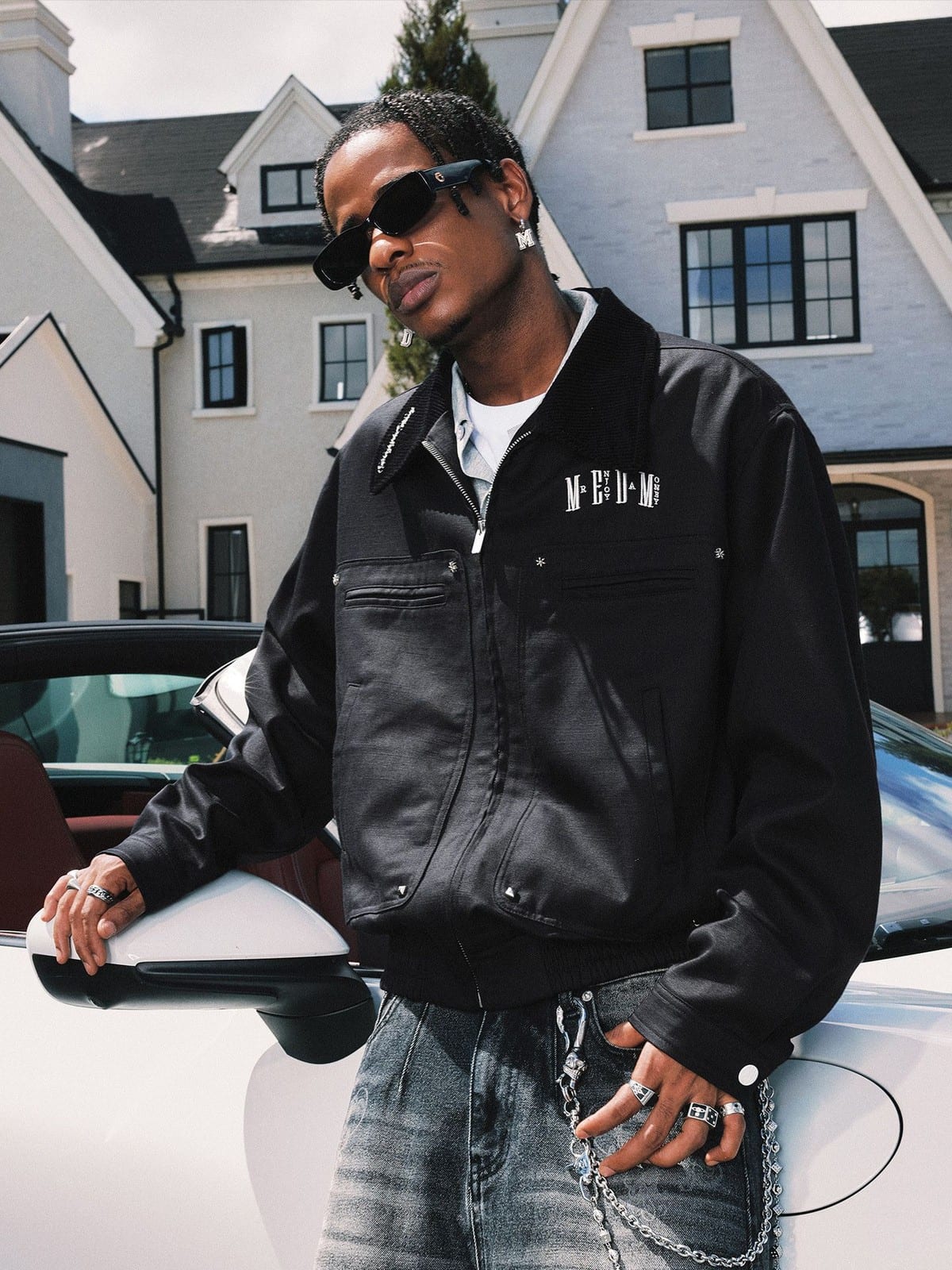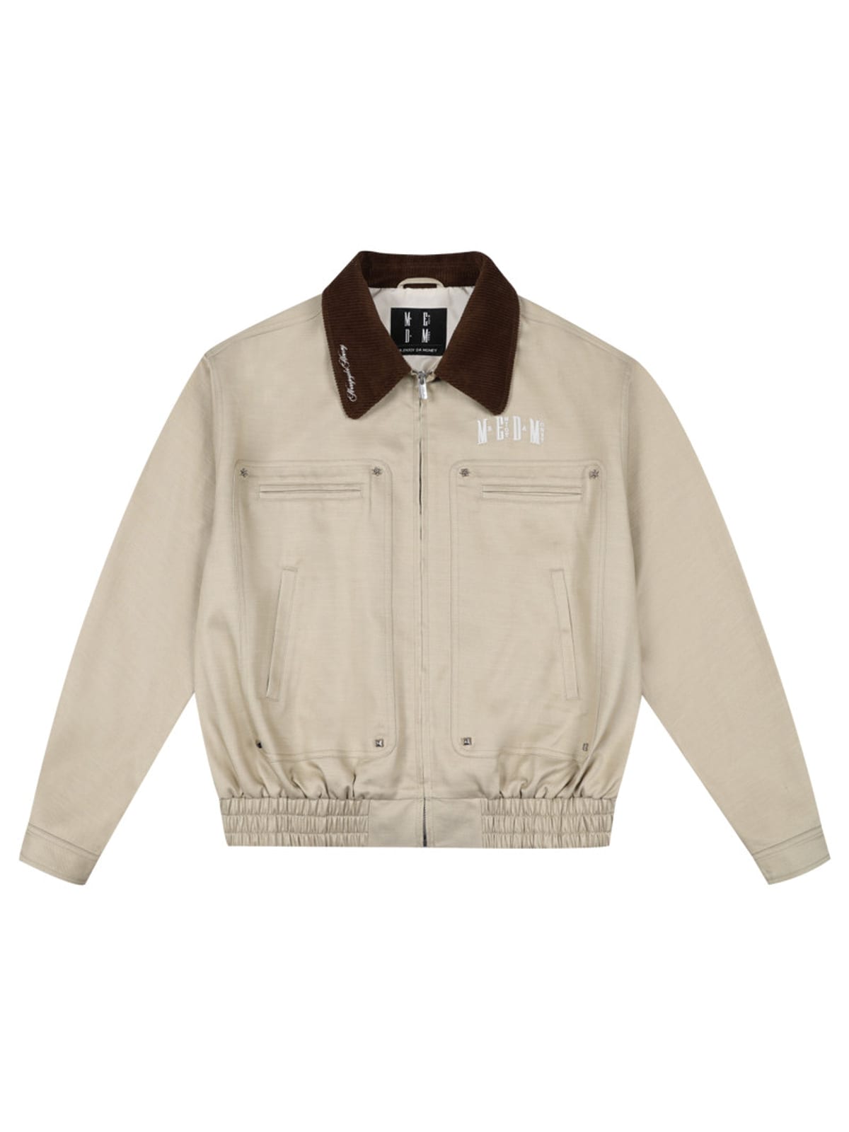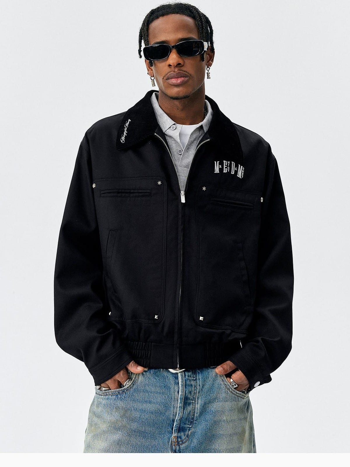 MEDM's Harrington jacket in a Lyocell and cotton blend. Pointed collar, zip-front closure, chest logo embroidery, and dual front pockets with rivet details.
