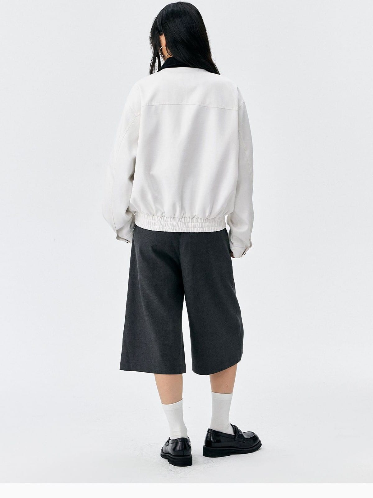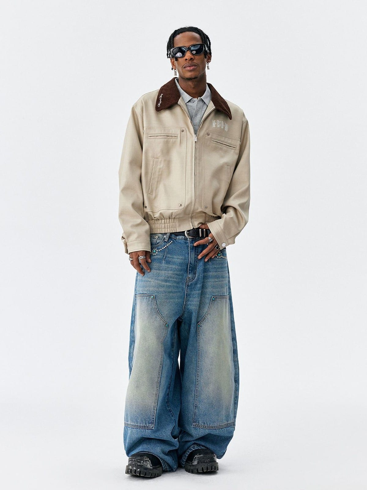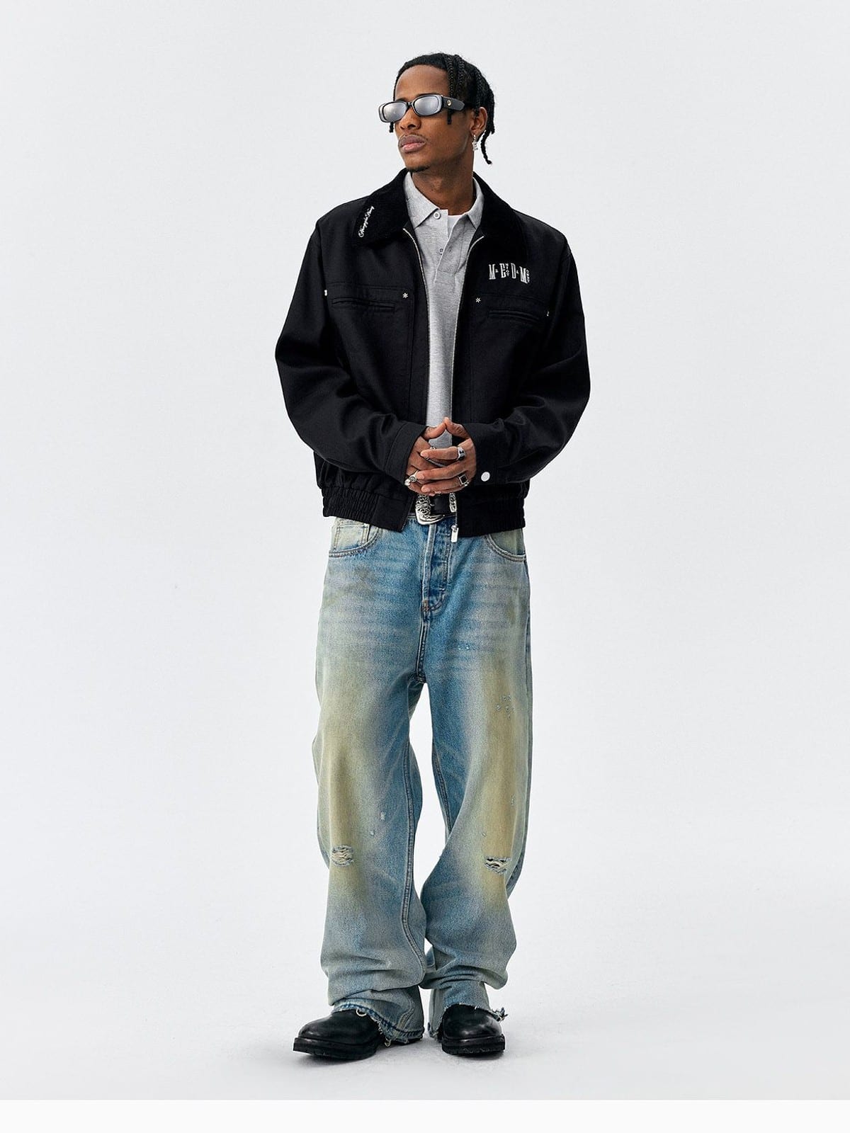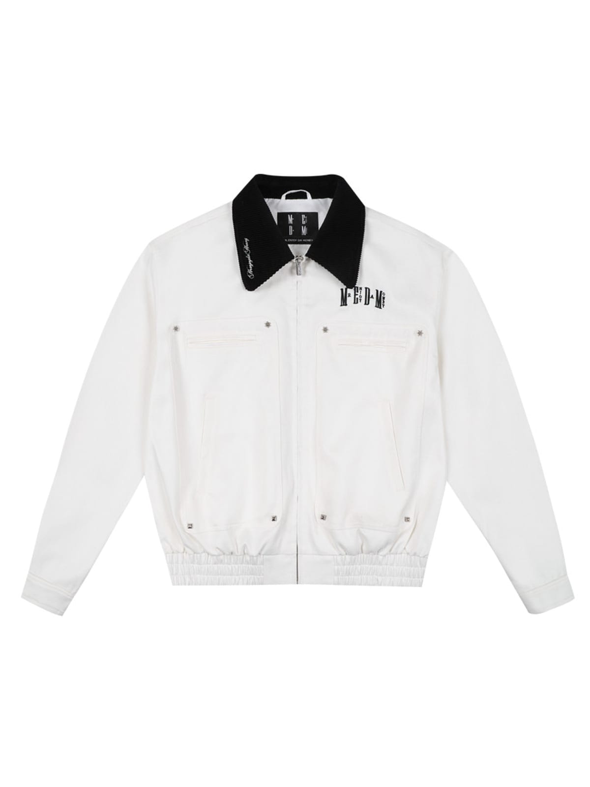 MEDM's Harrington jacket in a Lyocell and cotton blend. Pointed collar, zip-front closure, chest logo embroidery, and dual front pockets with rivet details.