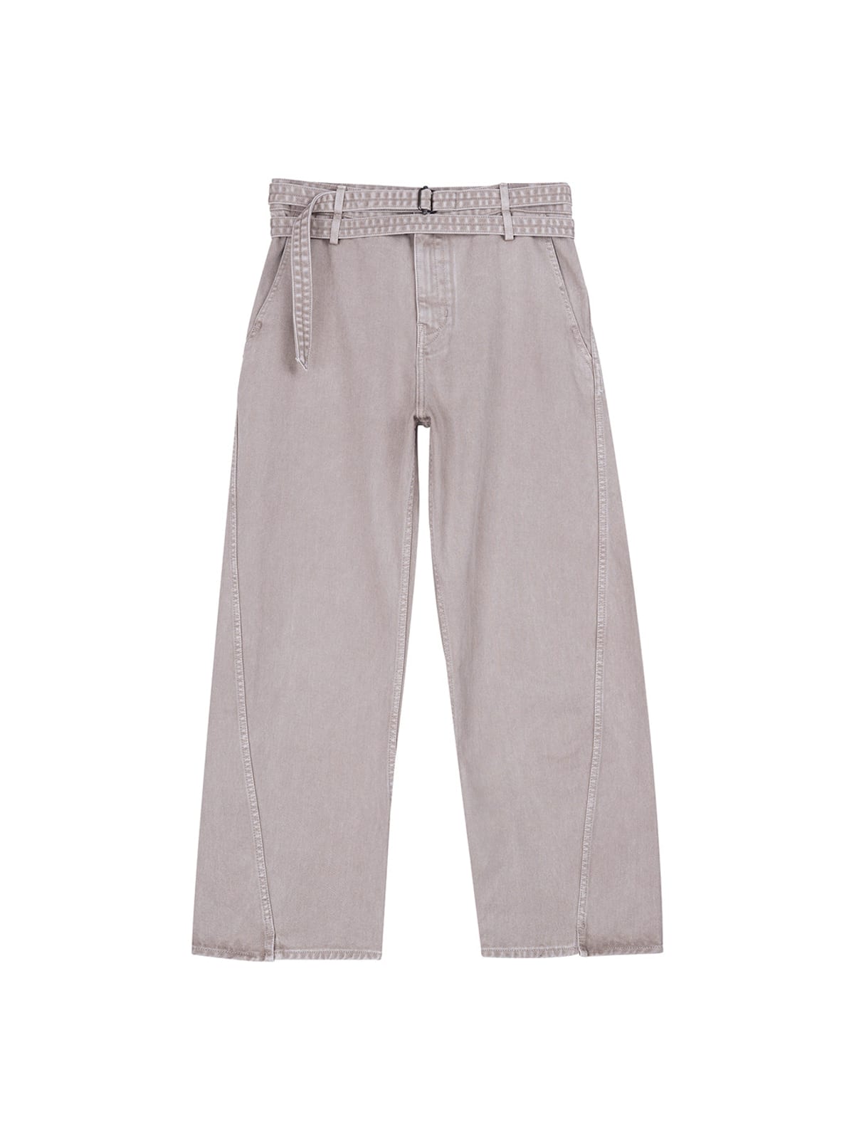 SIMPLE PROJECT's curved jeans in garment-dyed 100% cotton. Features an integrated twisted belt at the waist, curved leg seams, and a zip fly closure.