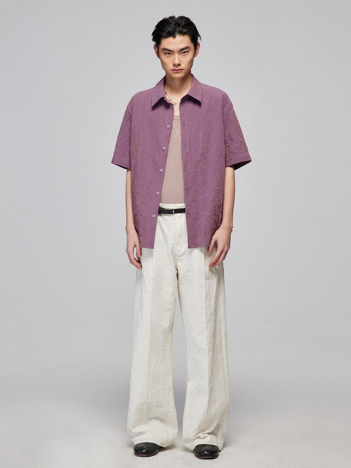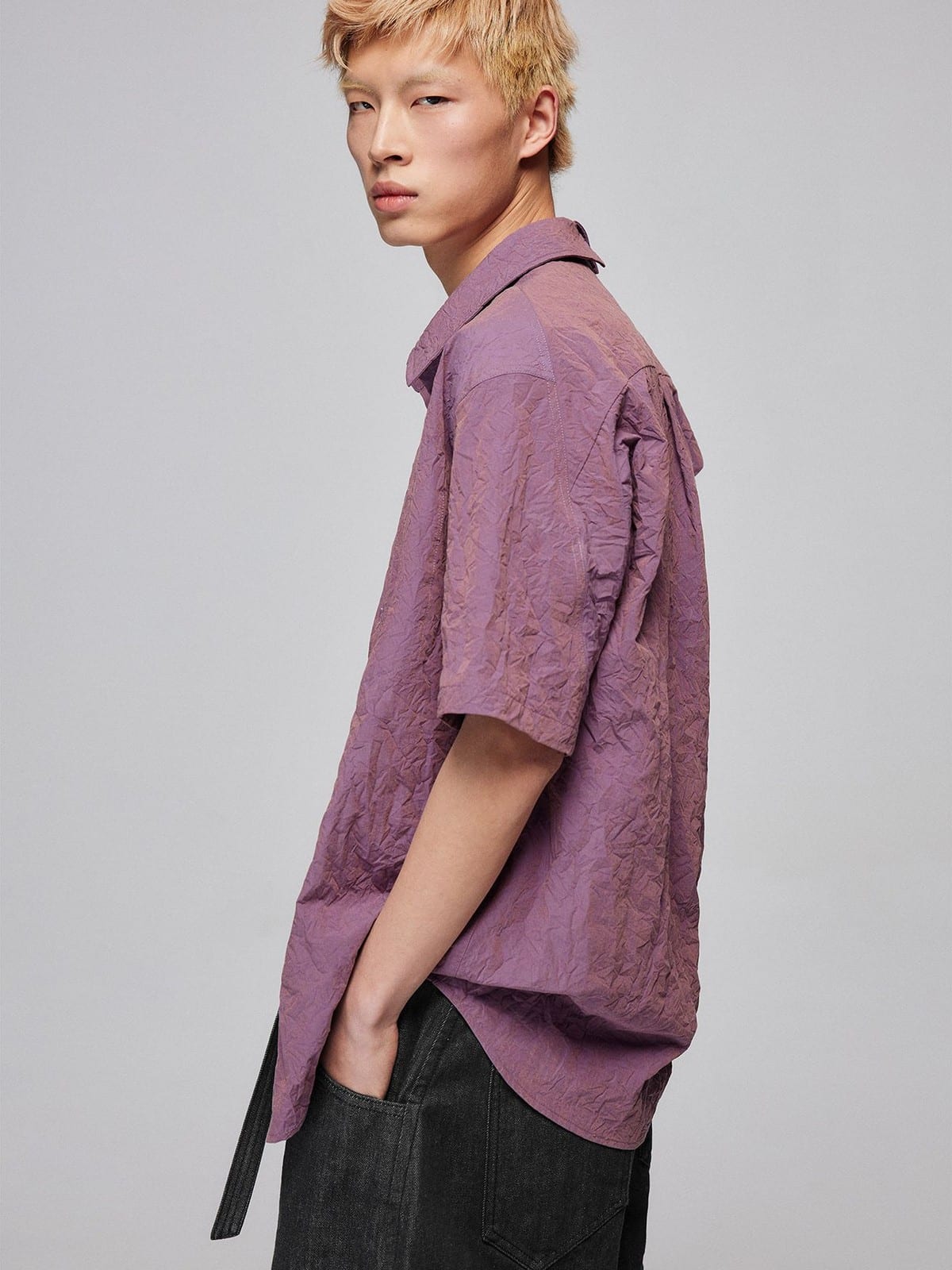SIMPLE PROJECT's short-sleeve shirt in a crinkled polyester, cotton, and linen blend. Open lapel collar, button-front closure, subtle embroidered details.