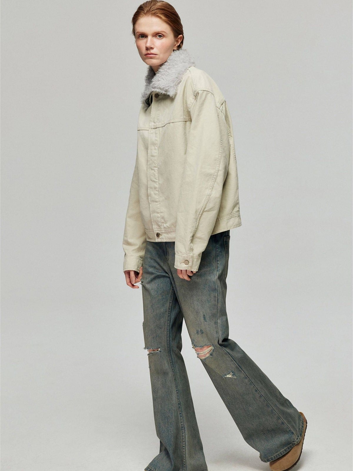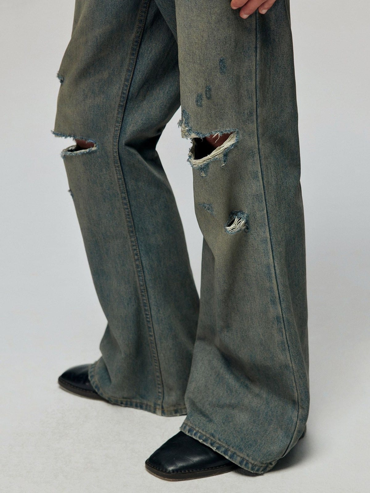 SIMPLE PROJECT's jeans in 100% cotton denim. Features a vintage dirty wash finish, slashed knee details, classic five-pocket styling, and a flared hem.