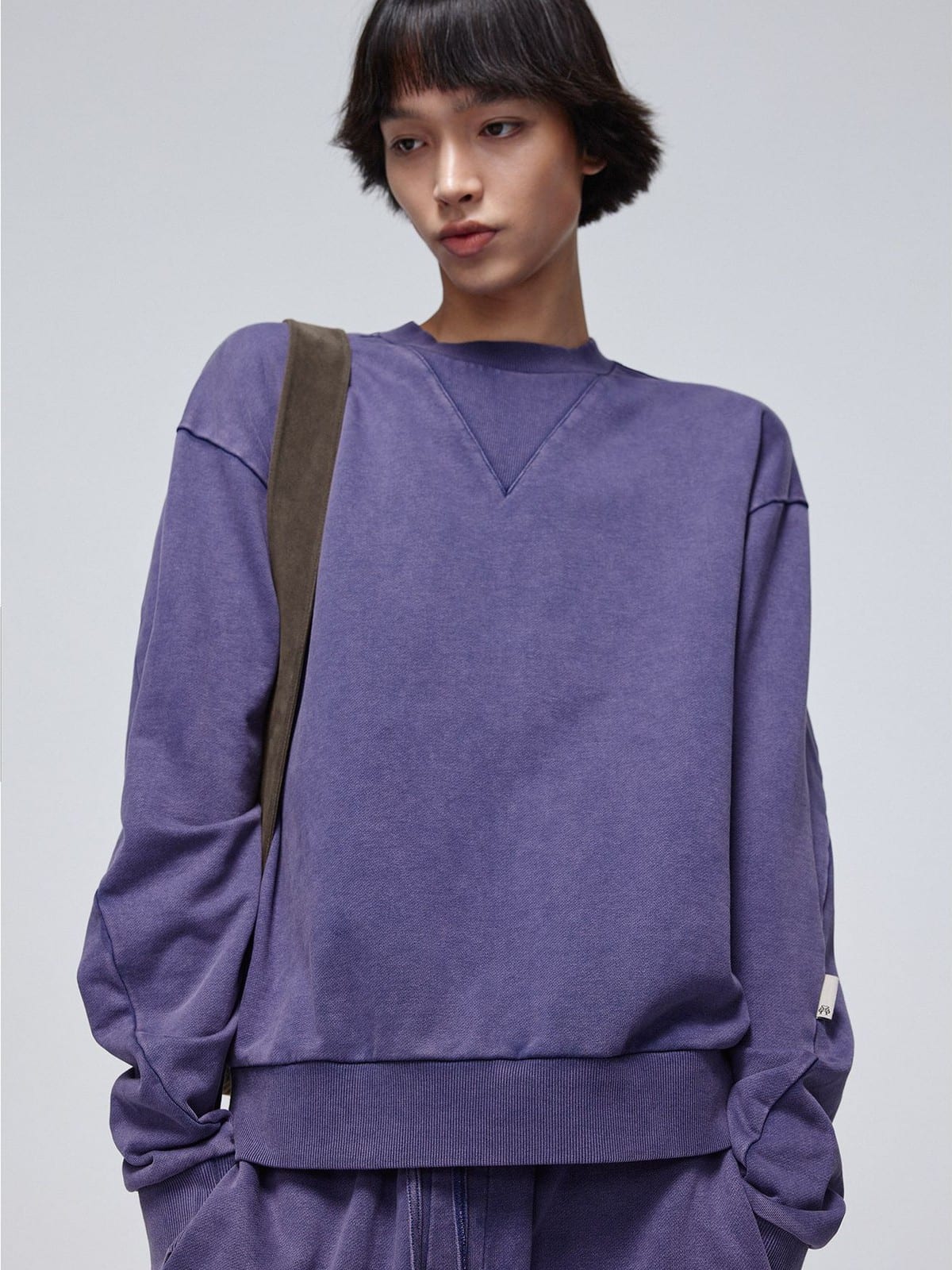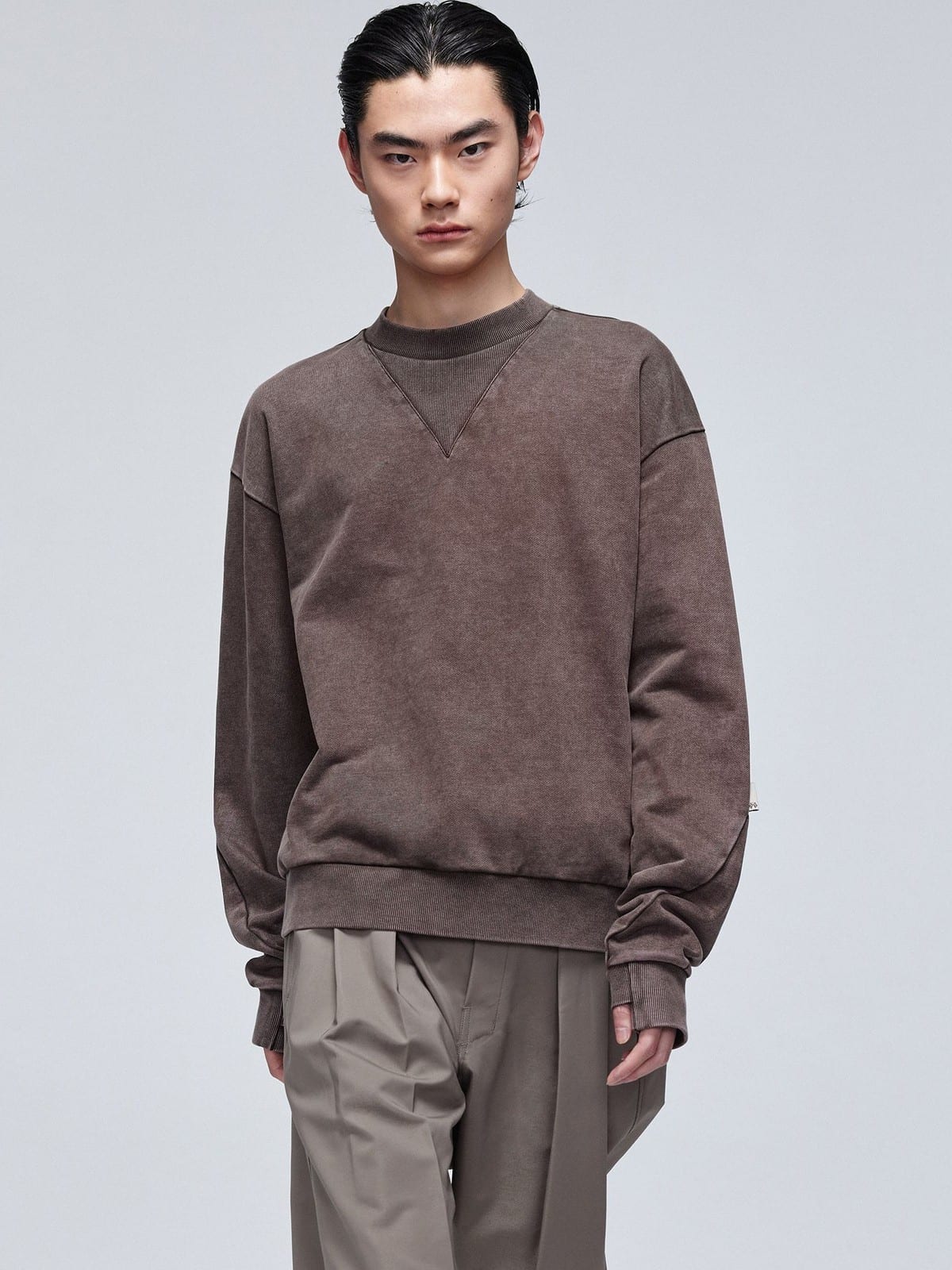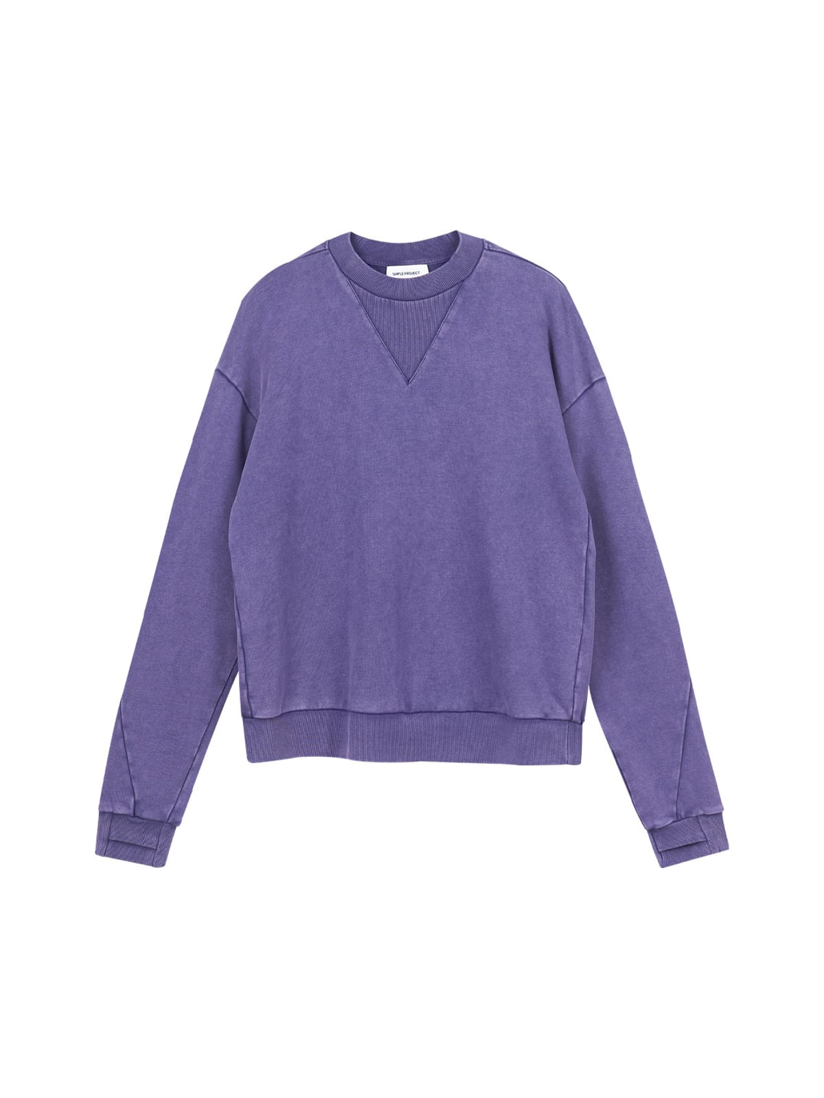 SIMPLE PROJECT's crewneck sweatshirt in 100% cotton. Styled with a faded wash finish, front V-stitch detail, and ribbed collar, cuffs, and hem.