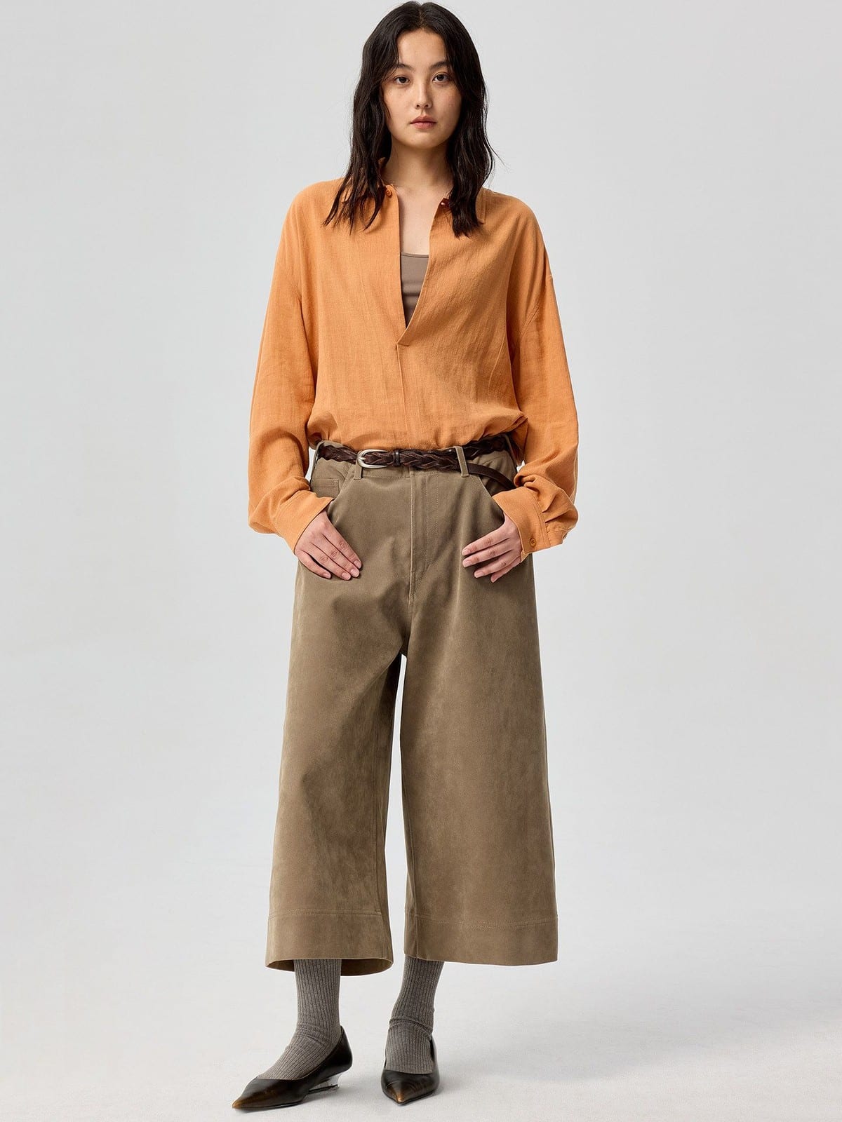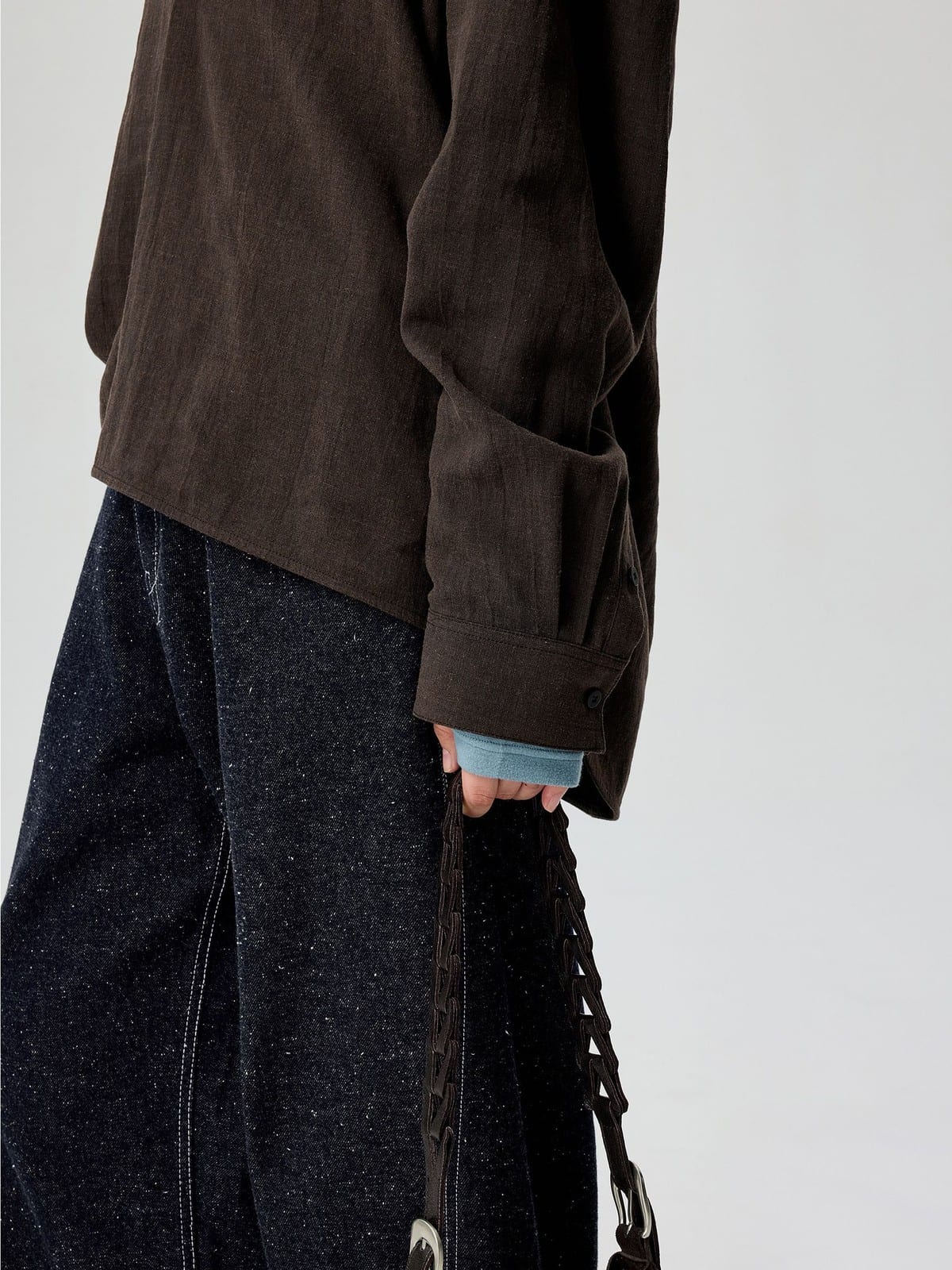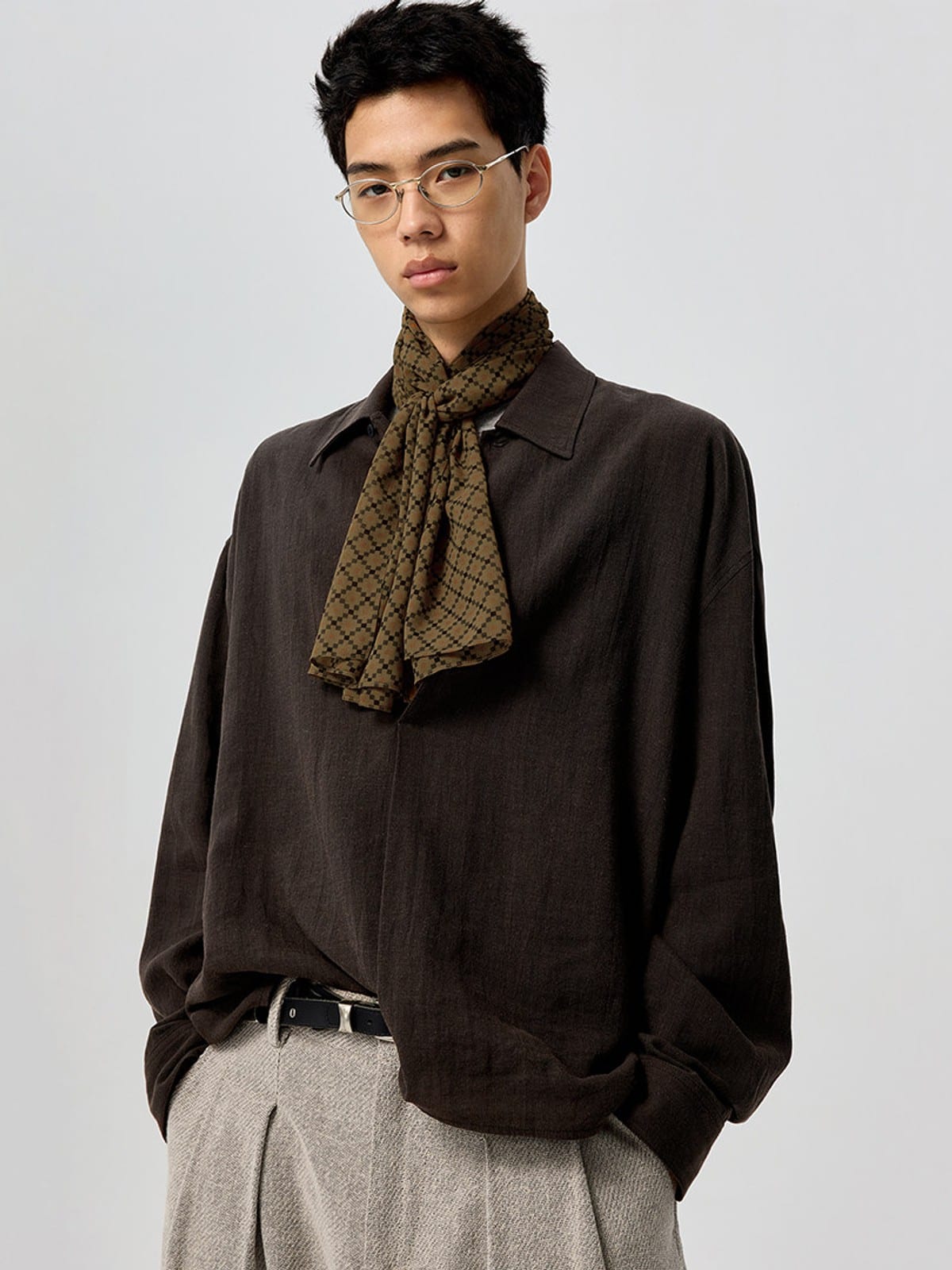 SIMPLE PROJECT's long-sleeve shirt in a lyocell and ramie blend. Features an open pointed collar, deep V-neckline, buttoned cuffs, and pleated front detailing.
